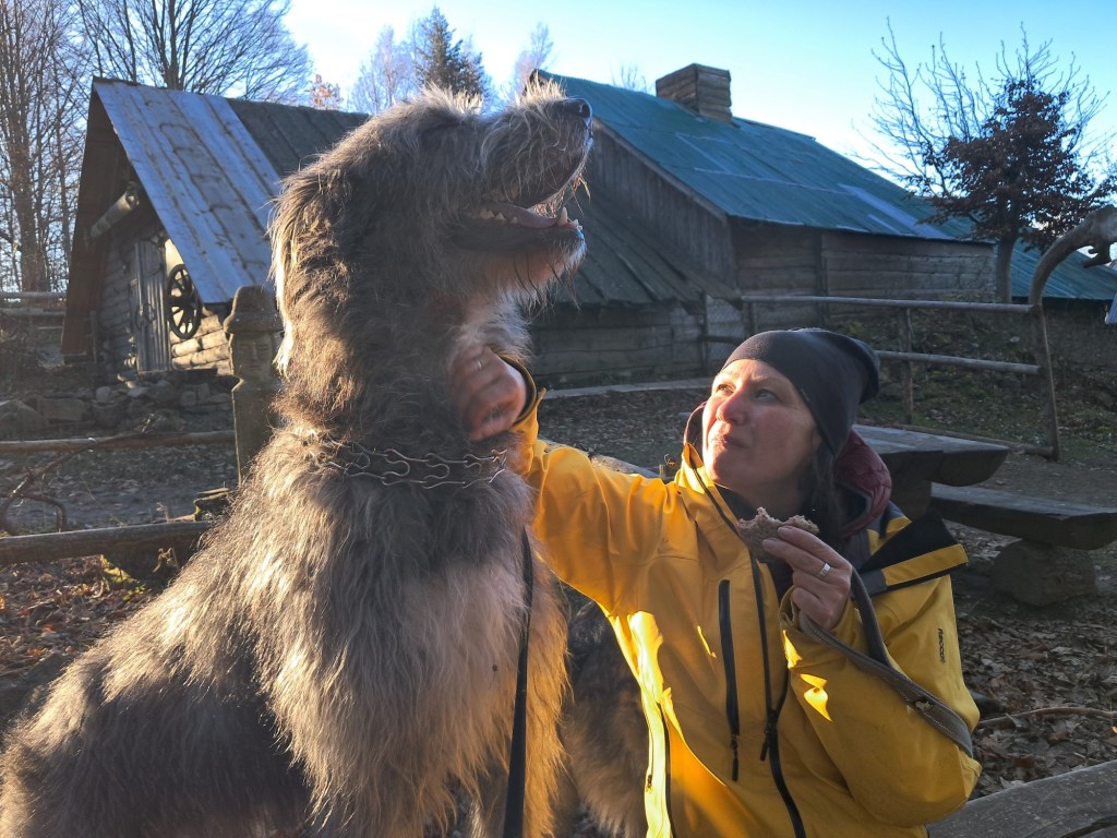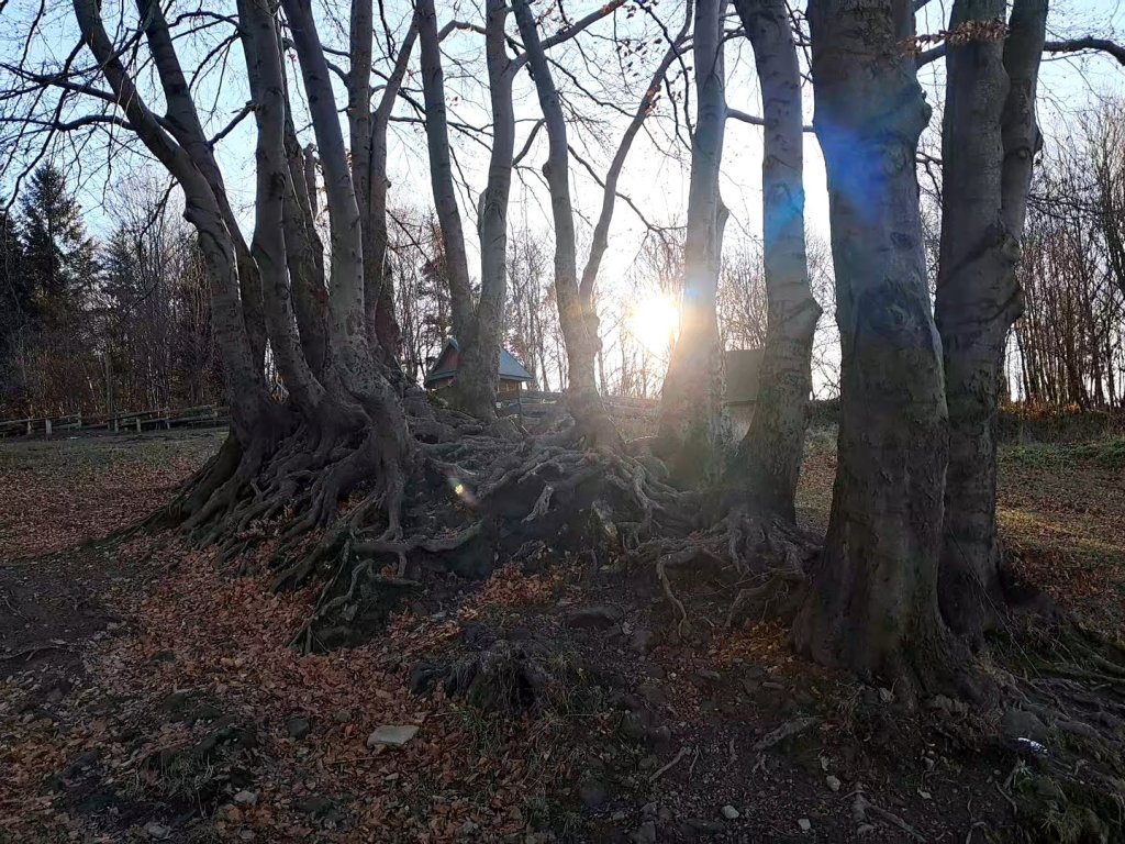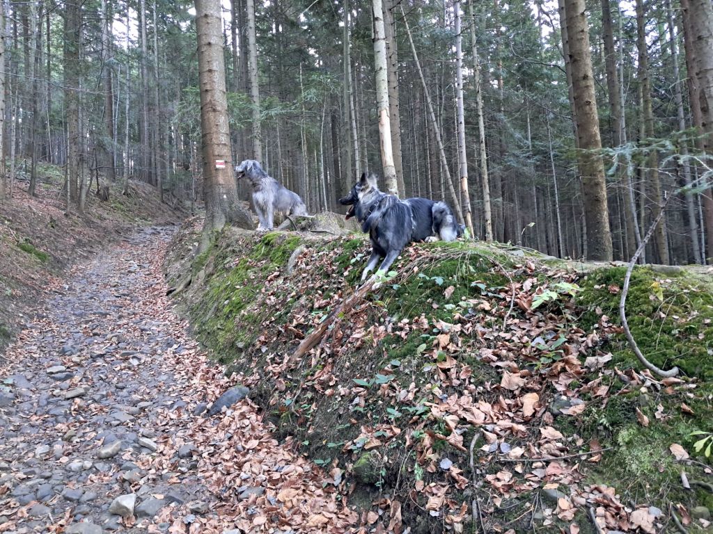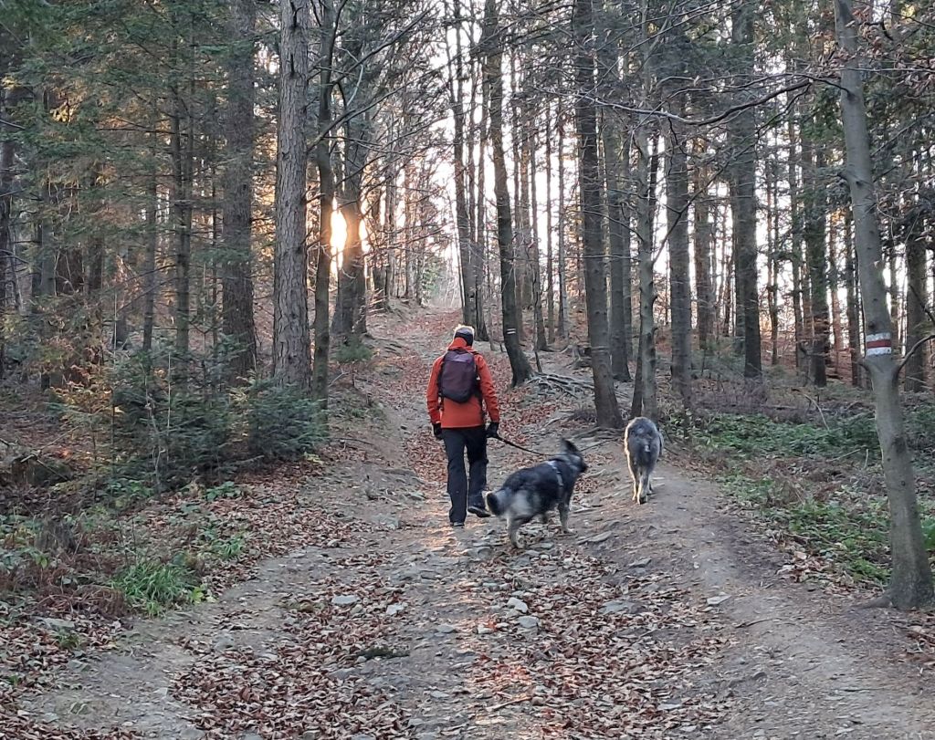 Ścieżka wiedzie przez bukowo-sosnowy las, a my pomimo późnolistopadowego poranka „przeczesujemy” wzrokiem ściółkę w poszukiwaniu prawdziwków. Hugo – w poszukiwaniu najlepszego patyka. I tak, rozkoszując się ciszą i pustką zakłócaną jedynie szelestem liści spod butów, szybciutko docieramy na teren schroniska, gdzie powitała nas panorama Beskidu Żywieckiego.