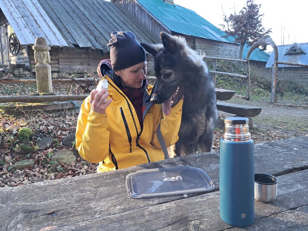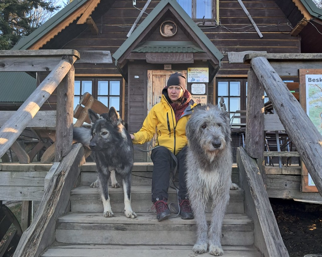 Gdy psiaki z apetytem pałaszują swoje chrupy, my szybciutko szykujemy kanapki i termos z herbatą, czyli nasze śniadanie, by za chwilkę pojechać na południowy wschód od Myślenic, w okolice Poręby. Tam, na skrzyżowaniu szlaków: żółtego, zielonego i czerwonego zostawiamy samochód i wybieramy kolor czerwony, który poprowadzi nas do Schroniska PTTK Kudłacze.
