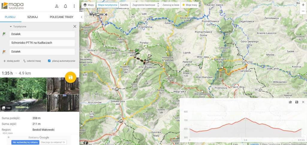 Czerwony szlak do Schroniska PTTK Kudłacze prowadzi z Myślenic i biegnie m.in. przez Uklejnę, Śliwnik i Działek, a jego długość wynosi niespełna 11 km. Wszystkim zmotoryzowanym polecam parking Myślenice Zarabie i rozpoczęcie wycieczki właśnie z tego miejsca. Z powodu wcześniej wspomnianych ograniczeń czasowych i miejsca rozpoczęcia „wycieczki” mamy do przejścia jedynie 2,5 km, a różnica wzniesień waha się w okolicach 100 m. Damy radę ;-D