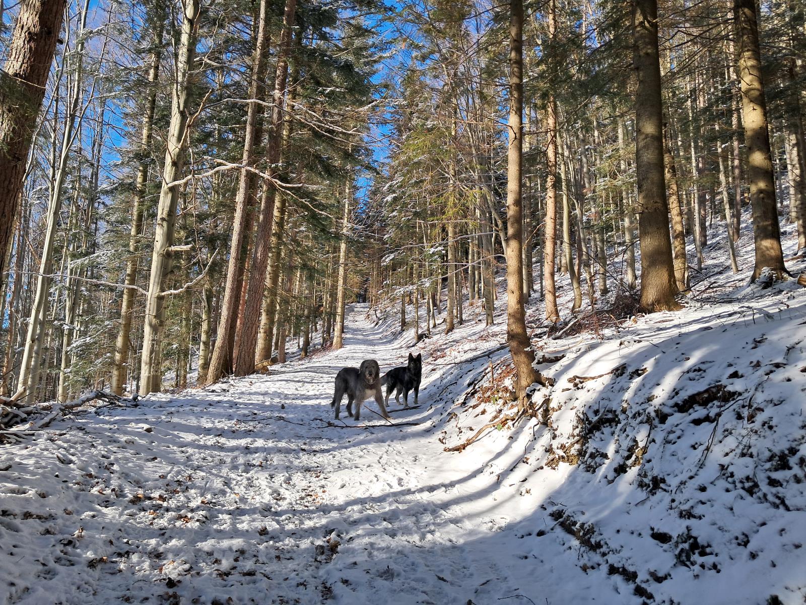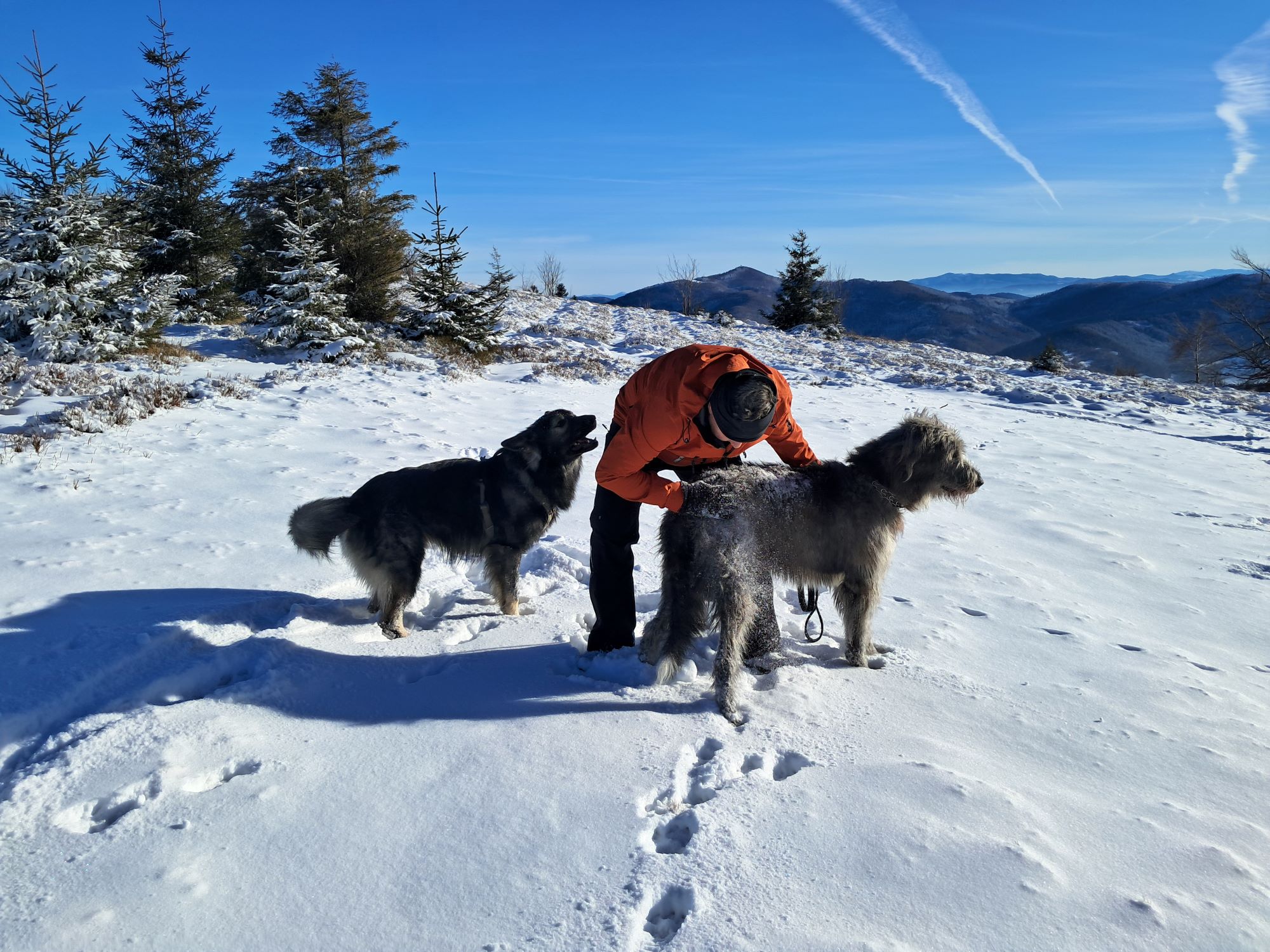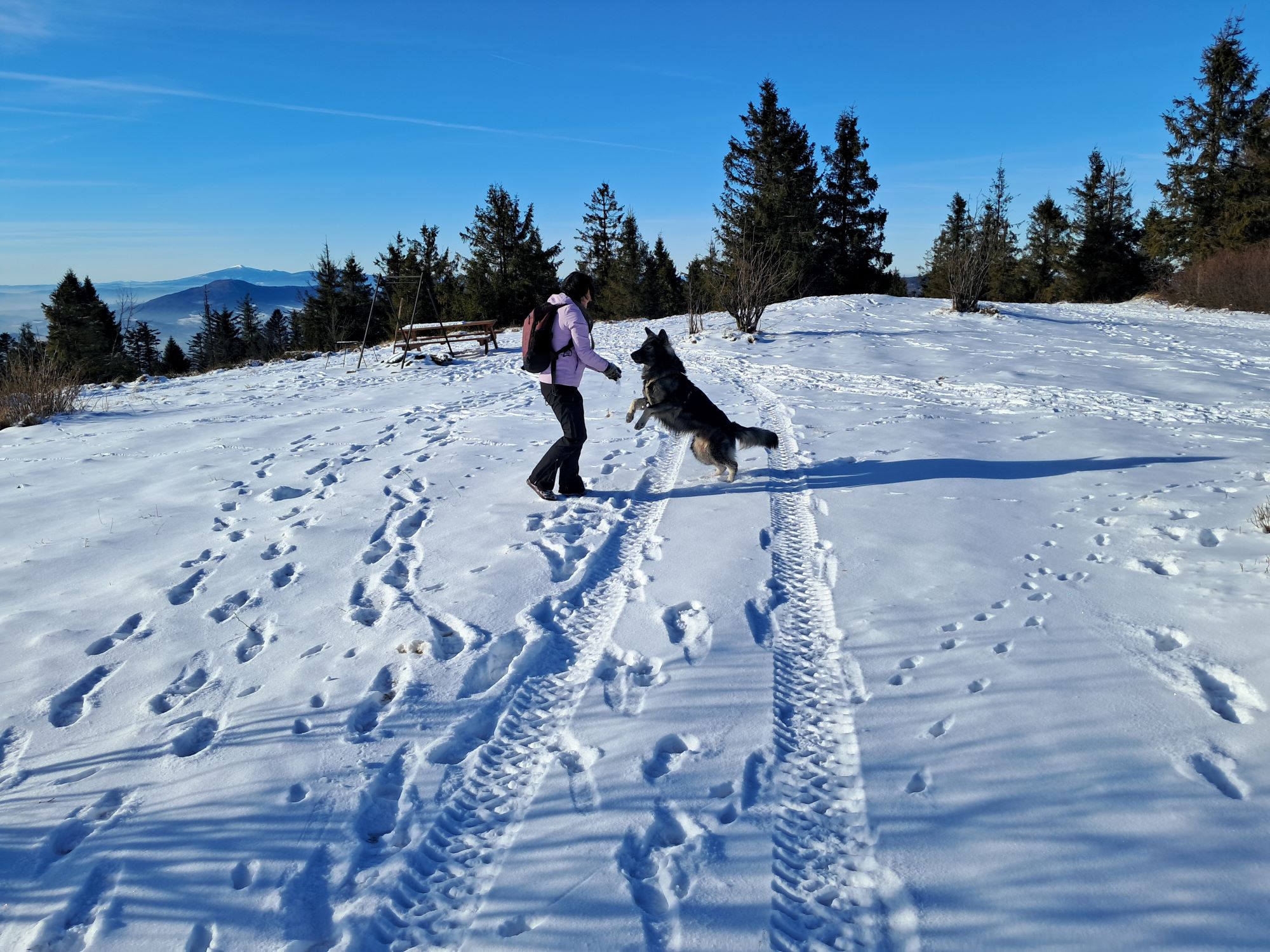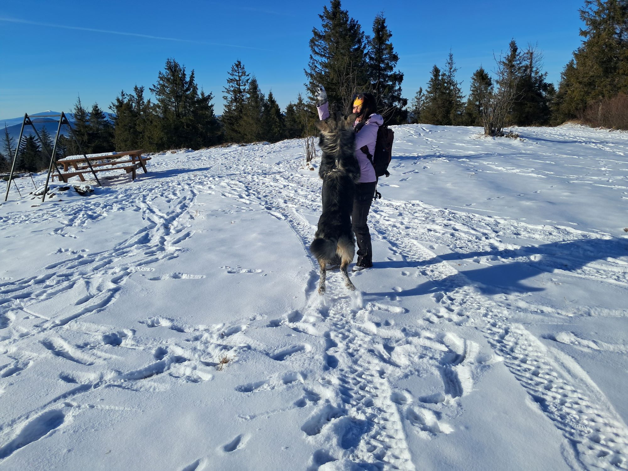 Długi, południowy stok polany wykorzystywany przez paralotniarzy do startu, nam służy za plac zabaw z Hugo i Lucky’m. A rzucanie i łapanie śnieżek w locie, czy nacieranie śniegiem sprawia radość nie tylko psiakom, ale i nam!