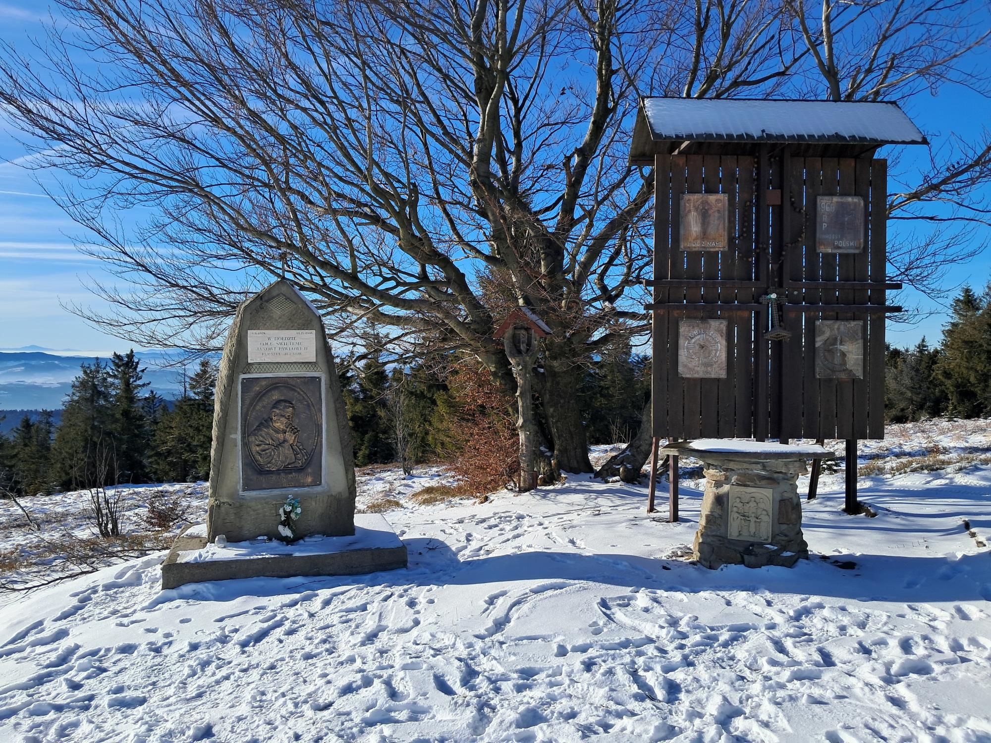Tak naprawdę celem dzisiejszej wycieczki nie było samo zdobycie Ćwilina, a wejście na Polanę Michurową – jedną z największych polan Beskidu Wyspowego, na której od XV wieku do lat 80-tych ubiegłego stulecia wypasano owce. Po co? Bo właśnie z niej roztacza się wspaniała panorama nie tylko na pobliskie szczyty, ale także Gorce, Tatry, Beskid Sądecki na wschodzie i Pasmo Babiogórskie z Babią Górą na zachodzie. A przy dzisiejszej pogodzie i widoczności mieliśmy gwarancję, by tego doświadczyć! Czyżby magia Świąt…
