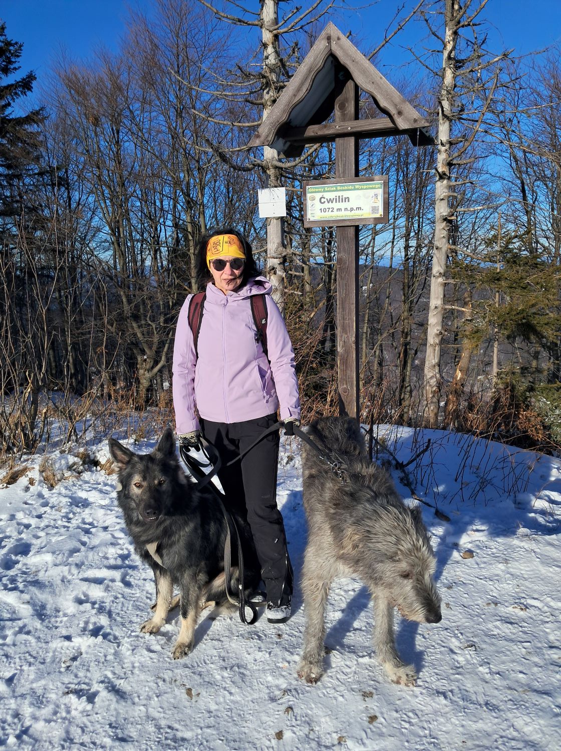 Gdy nasi Chłopcy jadą wylewać siódme poty na siłowni, my jedziemy z psiakami do Jurkowa. Zostawiamy samochód na dużym, bezpłatnym parkingu, w okolicach którego przebiega niebieski szlak. Można nim iść na Mogielicę (1171 m.n.p.m., najwyższy szczyt Beskidu Wyspowego) i dalej do Szczawy lub w przeciwnym kierunku przez Ćwilin, Śnieżnicę, aż do górnej stacji Kasina SKI. Wybieramy drogę na Ćwilin.