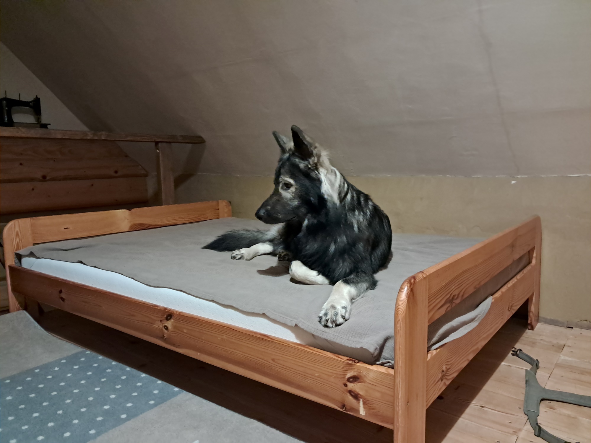 Niewielkie rozmiary domku przytulnie pomieszczą dwie osoby i psiaki, które do dyspozycji mają również szczelnie ogrodzony teren. Na parterze znajduje się kuchnia z salonikiem oraz łazienka, naprzeciwko której są schodki na poddasze. Schodki są na tyle strome, że trzeba było pomóc Hugusiowi pokonać je, natomiast Lucky nawet się nimi nie zainteresował. Miał do dyspozycji „swój dół” z kominkiem:) Poddasze to przytulna sypialnia, w której znajduje się też biureczko do pracy.