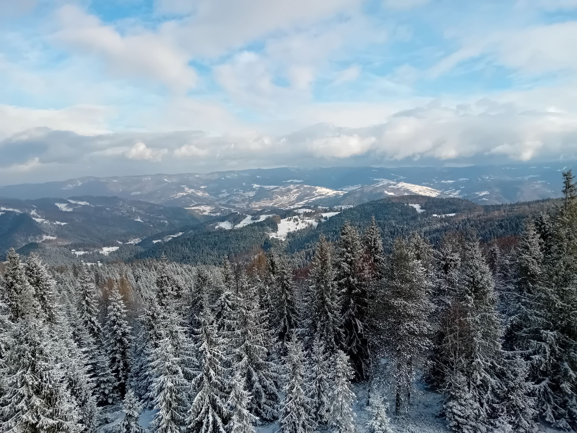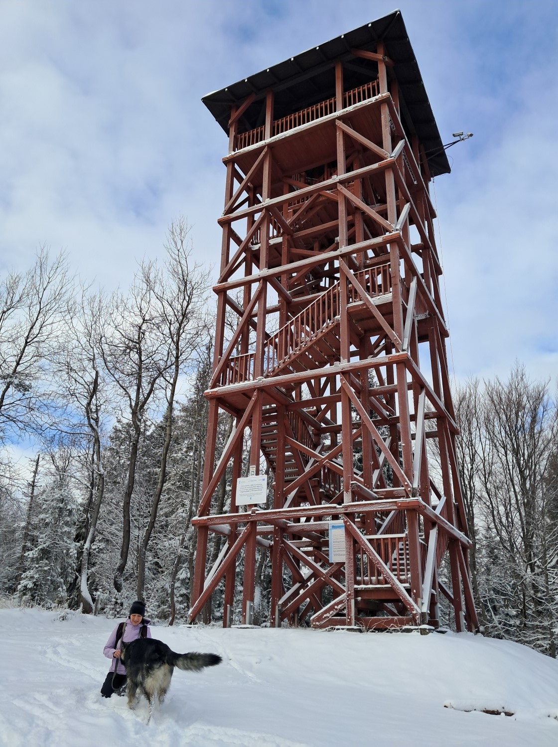 Tym sposobem po około 40 minutach dochodzimy do zielonego szlaku, który biegnie grzbietem, a odległość do szczytu Eliaszówki wynosi niespełna 500 m. Na szczycie znajduje się zadaszona wiata, w której popijamy herbatkę oraz wieża widokowa o wysokości 20 m, z której roztacza się widok na okolicę: tę dalszą i bliższą.