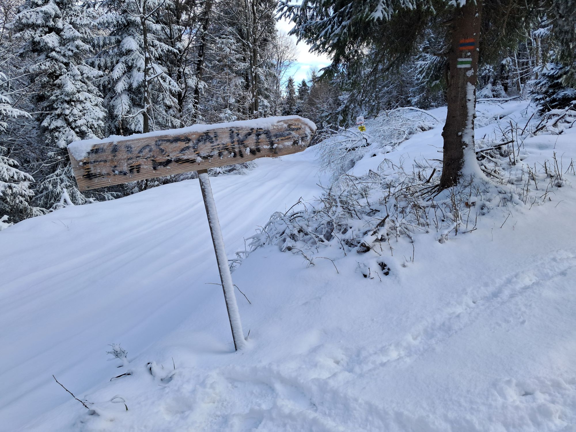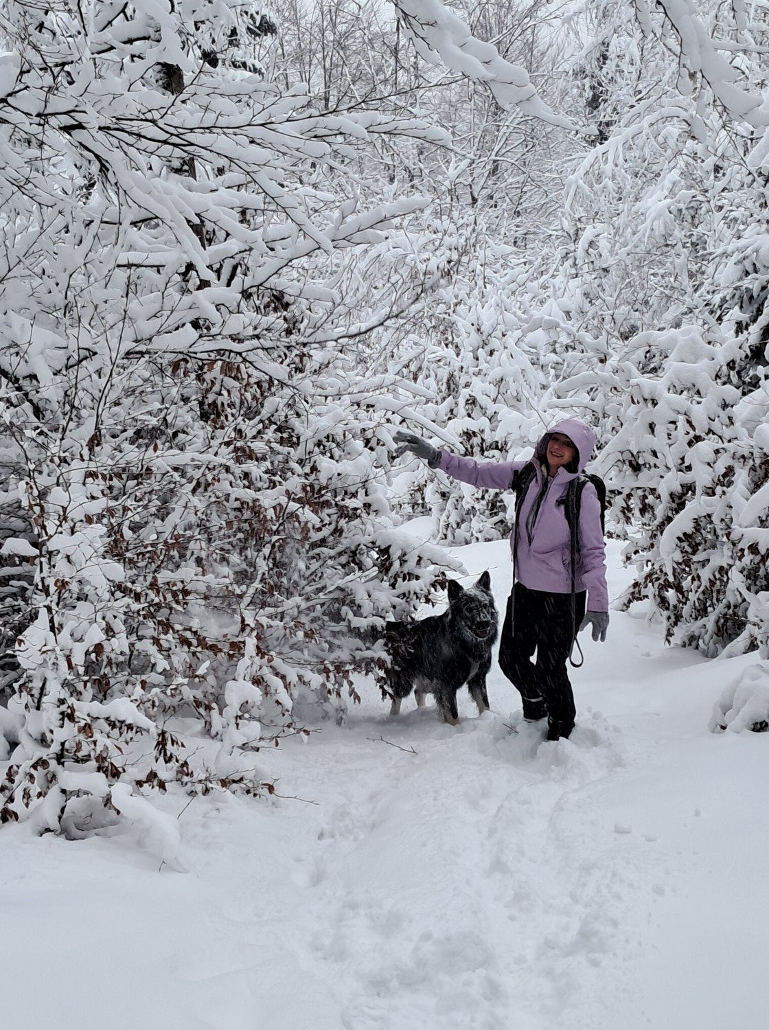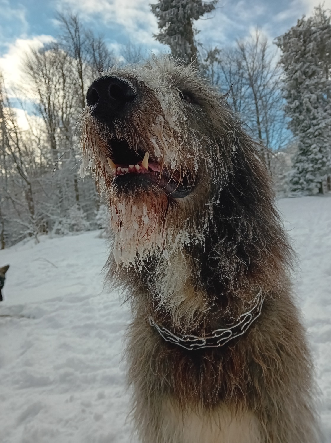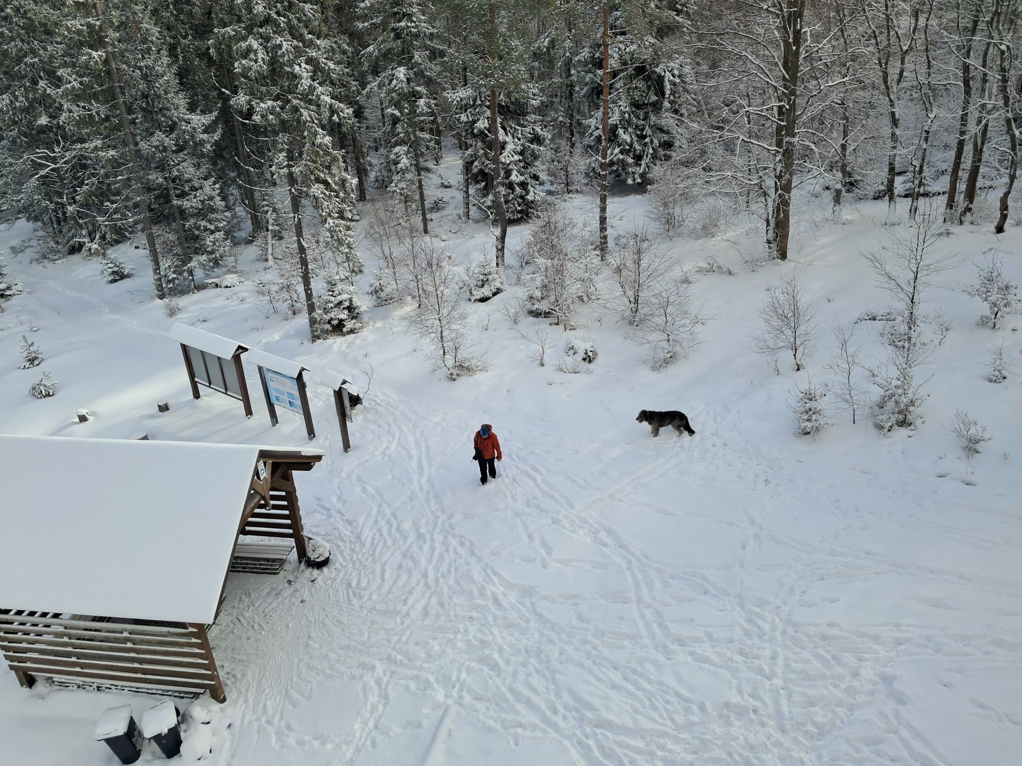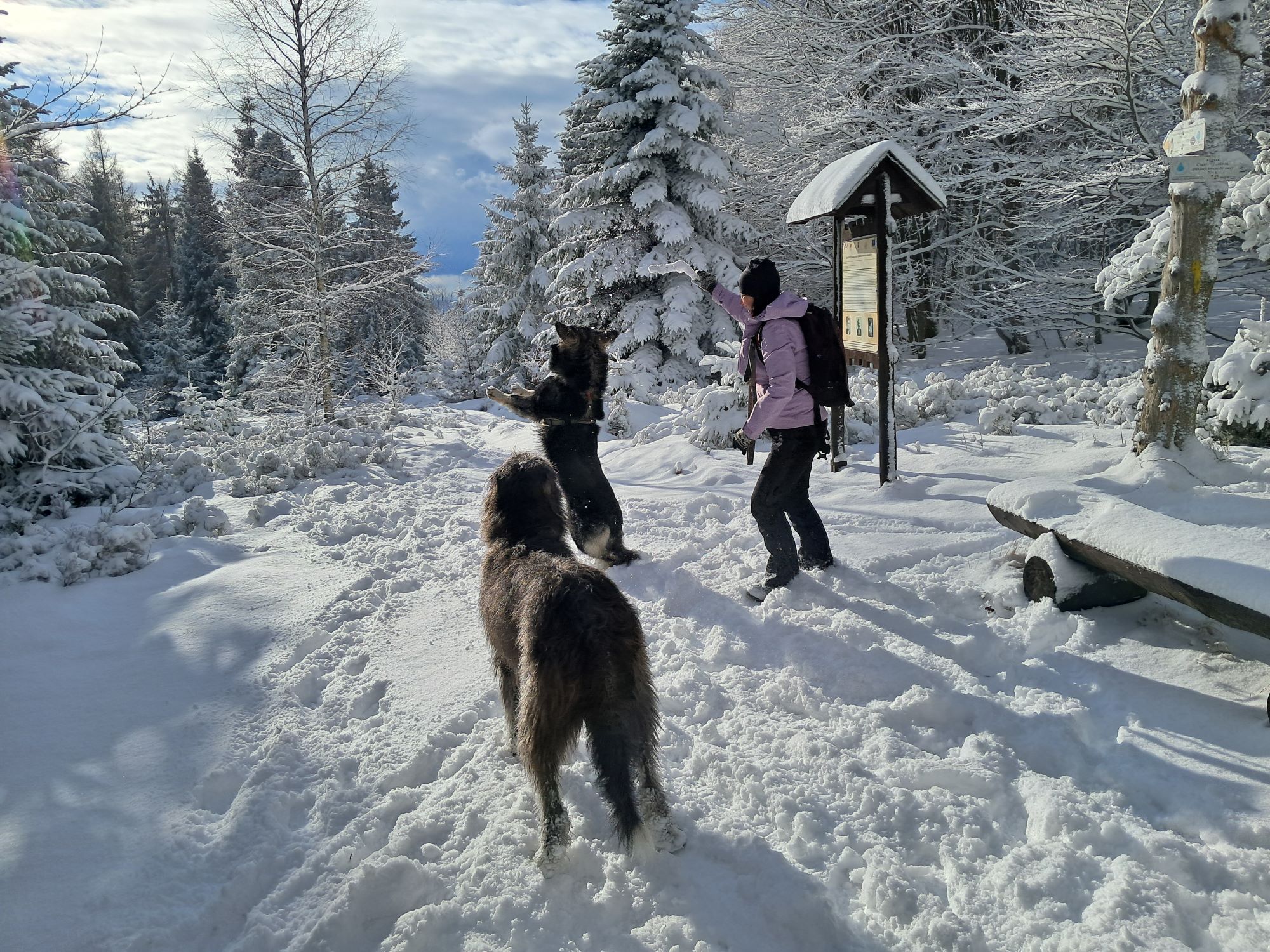 Jakież było nasze zdziwienie z Hugusiem, gdy zobaczyliśmy Lakusia, który czekał już przed schroniskiem – niestety tu również pieski nie mogą wchodzić do środka. Po szybkiej przekąsce postanowiliśmy dalej ruszyć razem;) Dokąd? Na Eliaszówkę! Stąd zielonym szlakiem to już niespełna 45 minut drogi, a drogę ze szczytu do domku mamy opanowaną. W porównaniu do dnia wczorajszego śniegu przybyło i momentami idzie się dużo wolniej. I tak mniej więcej w podanym czasie zdobywamy szczyt po raz drugi.