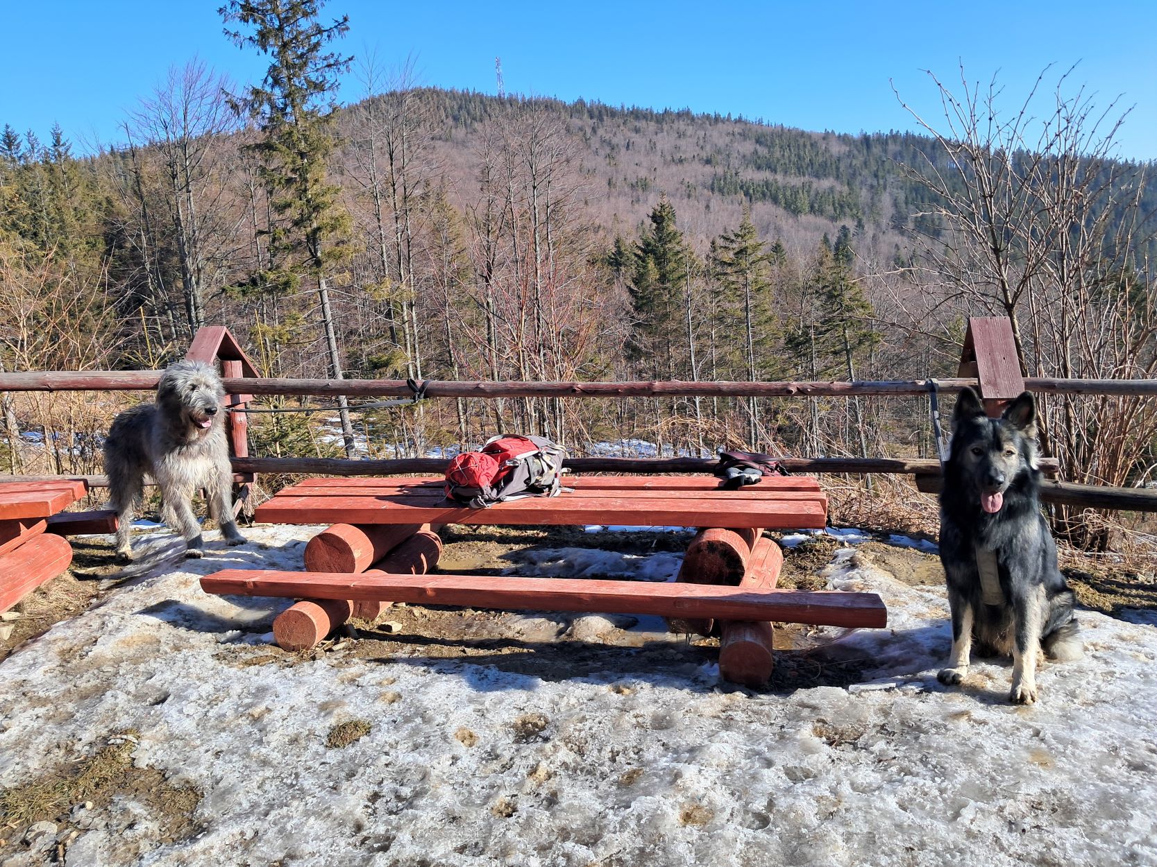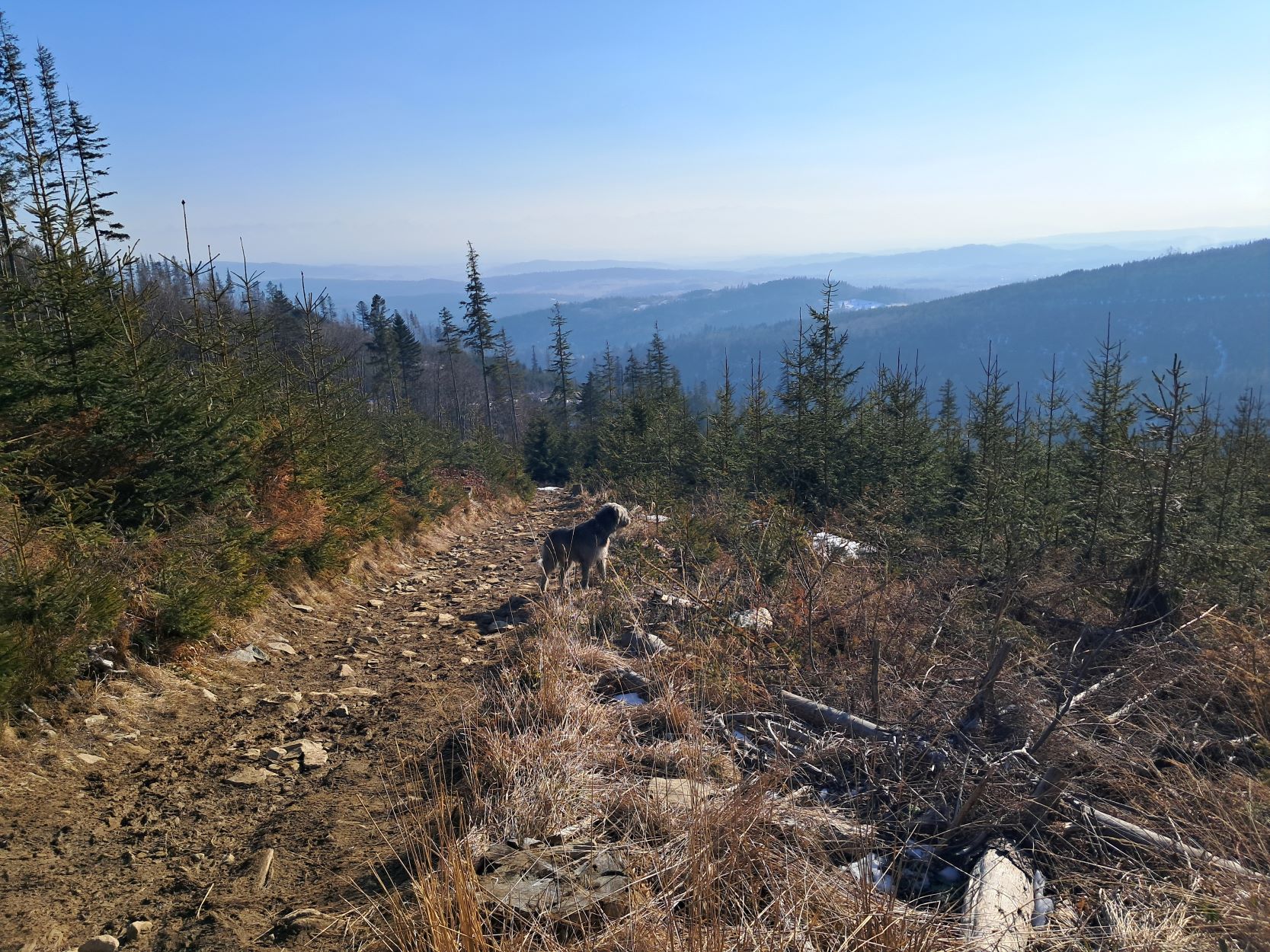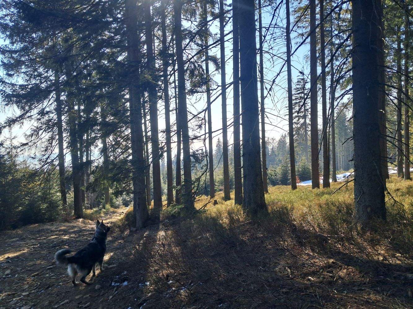 Przez pierwsze metry idziemy kamienistą ścieżką w ogóle nie pamiętając, że jest środek zimy. Dopiero wyjście na mniej zalesioną przestrzeń i odrobina zbitego jak beton śniegu przypomina o tym fakcie. Jednak i ta odrobina spotyka się z wielką radością psiaków, a my przysiadając na pieńkach dajemy im czas na zabawę.