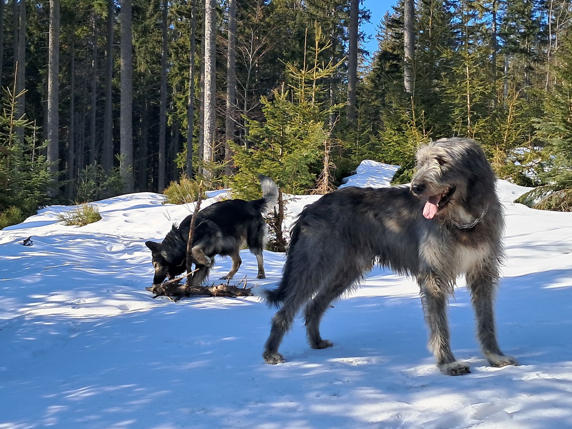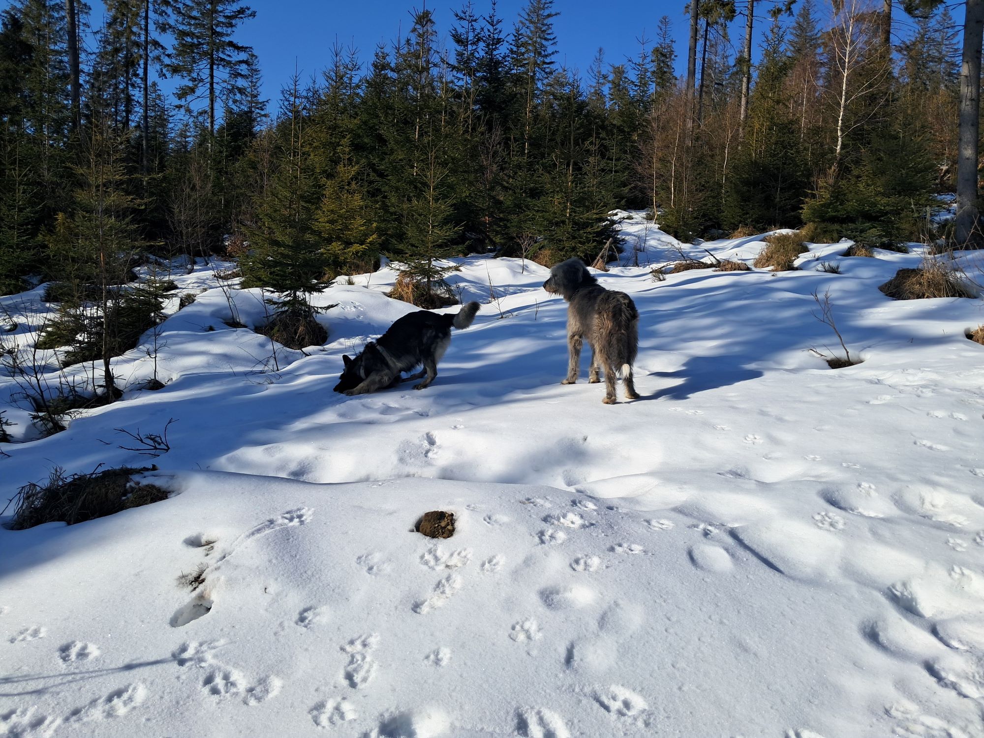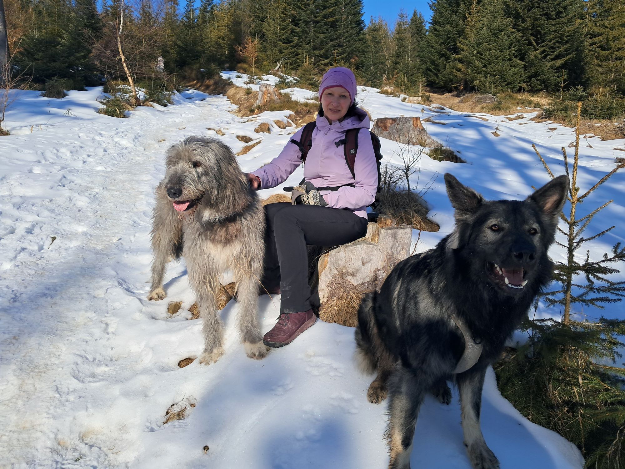 Przez pierwsze metry idziemy kamienistą ścieżką w ogóle nie pamiętając, że jest środek zimy. Dopiero wyjście na mniej zalesioną przestrzeń i odrobina zbitego jak beton śniegu przypomina o tym fakcie. Jednak i ta odrobina spotyka się z wielką radością psiaków, a my przysiadając na pieńkach dajemy im czas na zabawę.