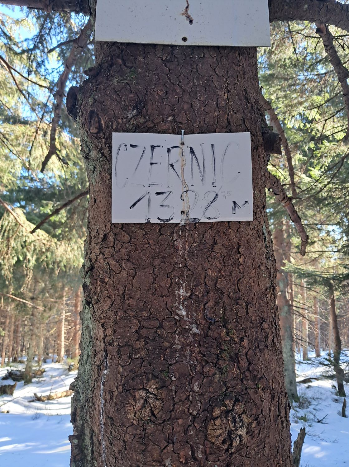 I tu dwie ciekawostki. Pierwsza: niebieskim szlakiem z Policy, przez Czernic właśnie i Przełęcz Zubrzycką biegnie Wielki Europejski Dział Wodny oddzielający zlewiska Morza Bałtyckiego i Morza Czarnego, a druga: stojąc na jego szczycie mamy dwie tabliczki z różnymi nazwami i różnymi wysokościami!