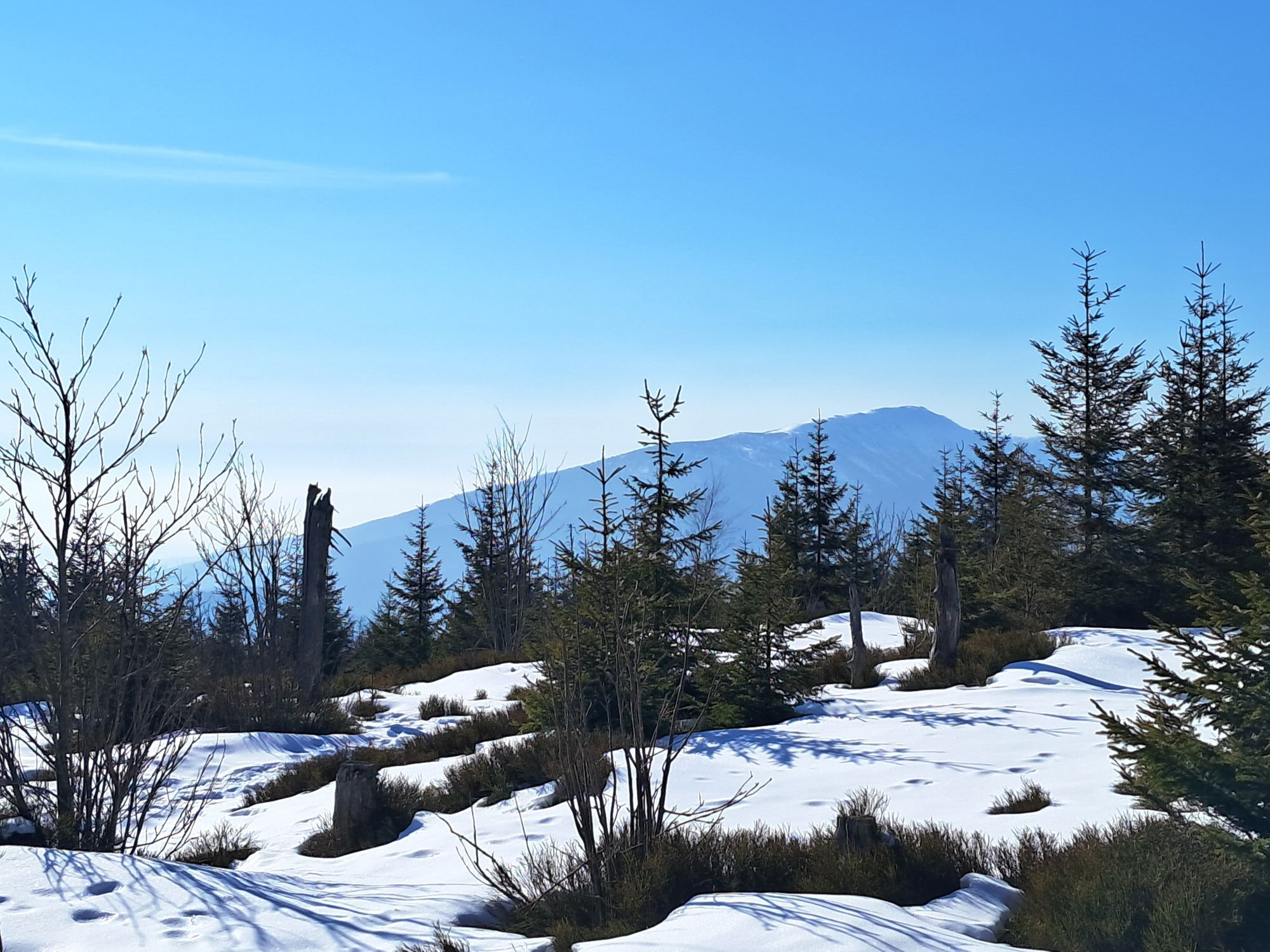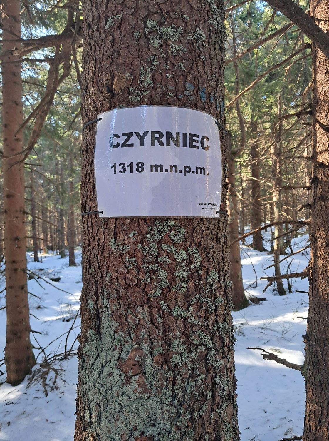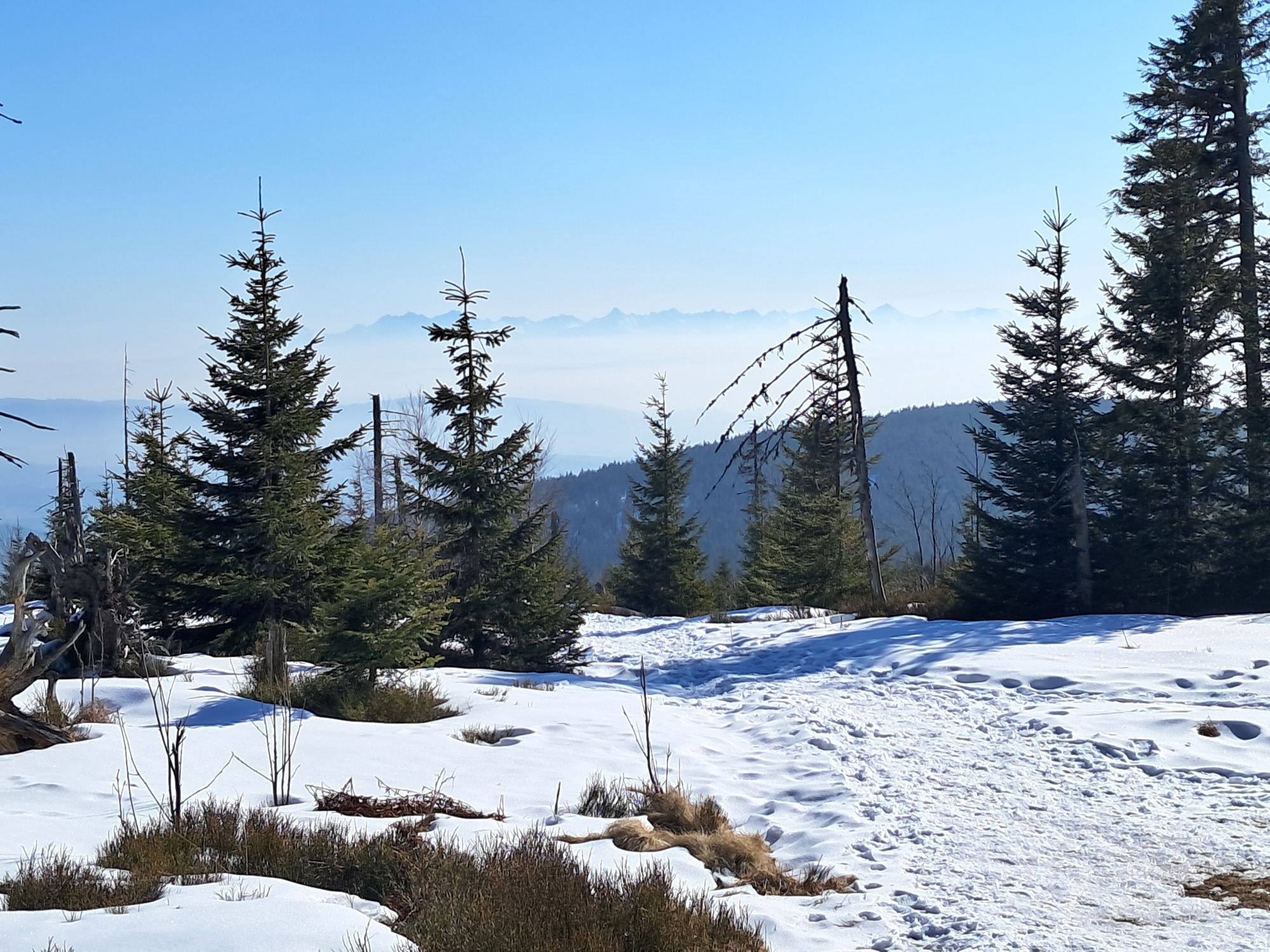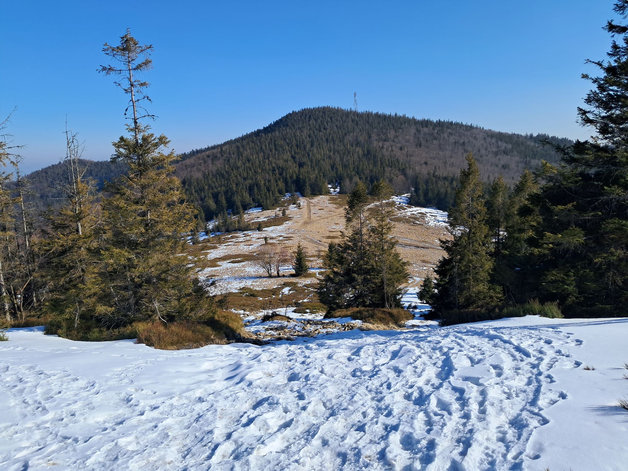 Wybawieni ruszamy dalej. Ścieżka pnie się delikatnie pod górę, a śniegu jak na lekarstwo. Za to miejscami pojawiają się oblodzenia, na których lepiej uważać. Wzięte na wszelki wypadek raczki bezużytecznie leżą w plecaczkach. A już na pewno nie są potrzebne na podejściu na Czernic – szczyt w Paśmie Policy.