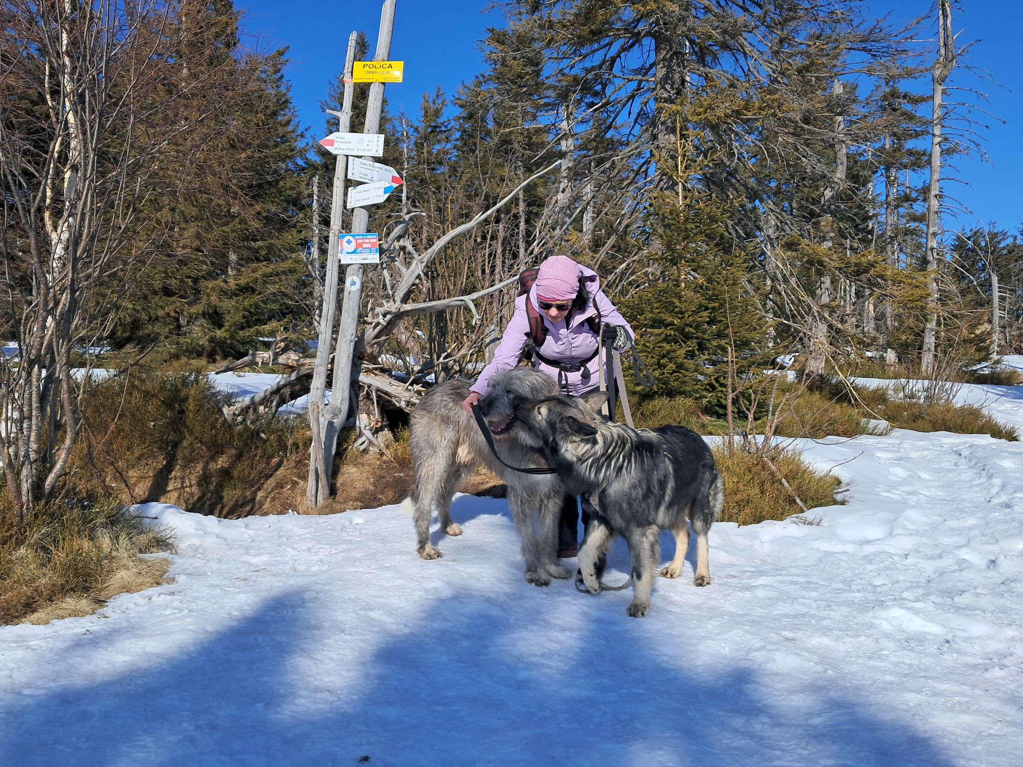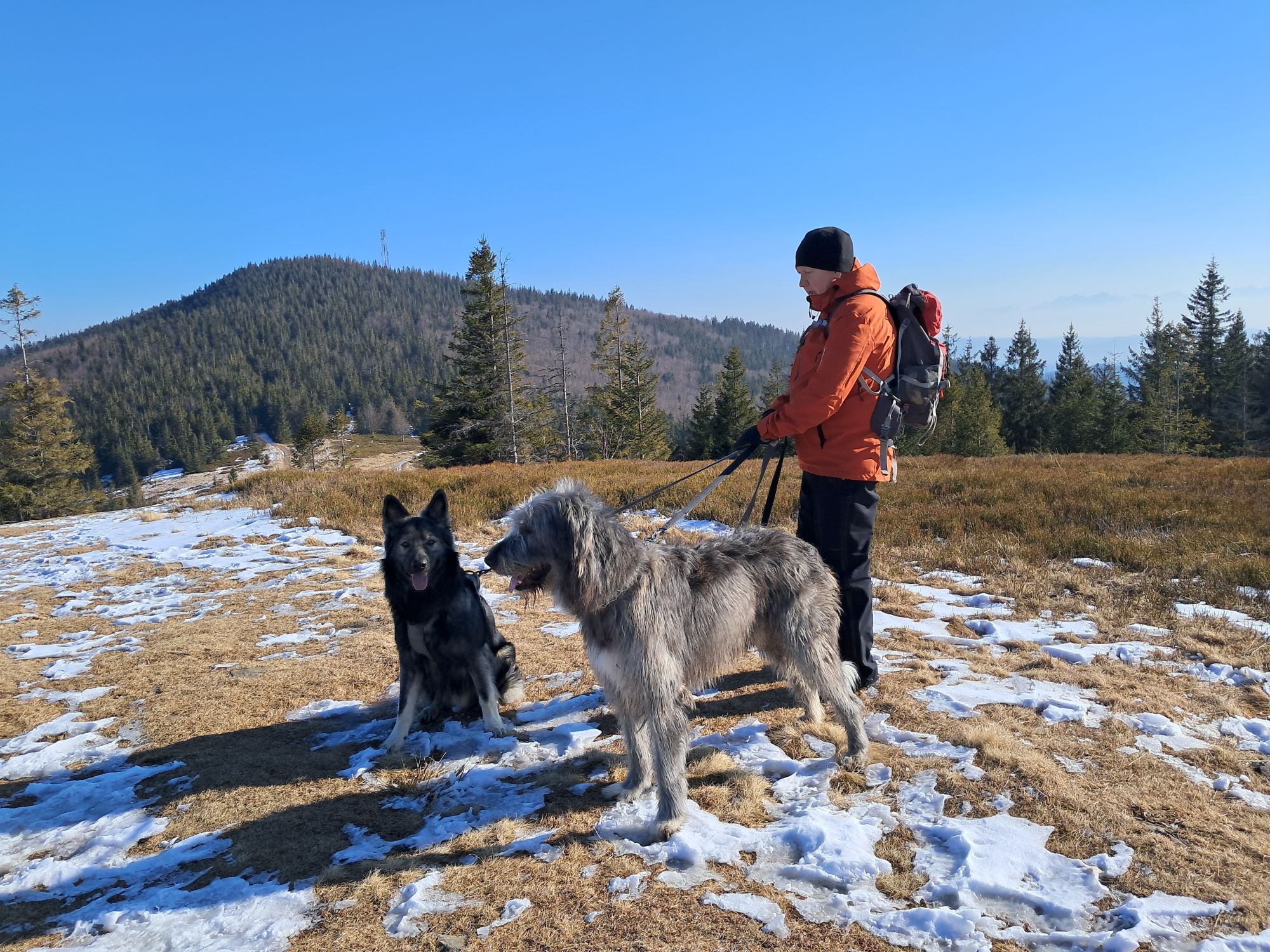 Nasyceni widokami i promieniami południowego słońca ruszamy w stronę Schroniska PTTK na Hali Krupowej. Po drodze wychodzimy z psiakami na Kocią Łapę (1182m.n.p.m.) skąd rozciąga się widok na Halę i Przełęcz Kucałową, będącą skrzyżowaniem wielu szlaków (więcej tutaj https://psyjazne.com/2024/12/25/jesienne-impresje-na-hali-krupowej/)