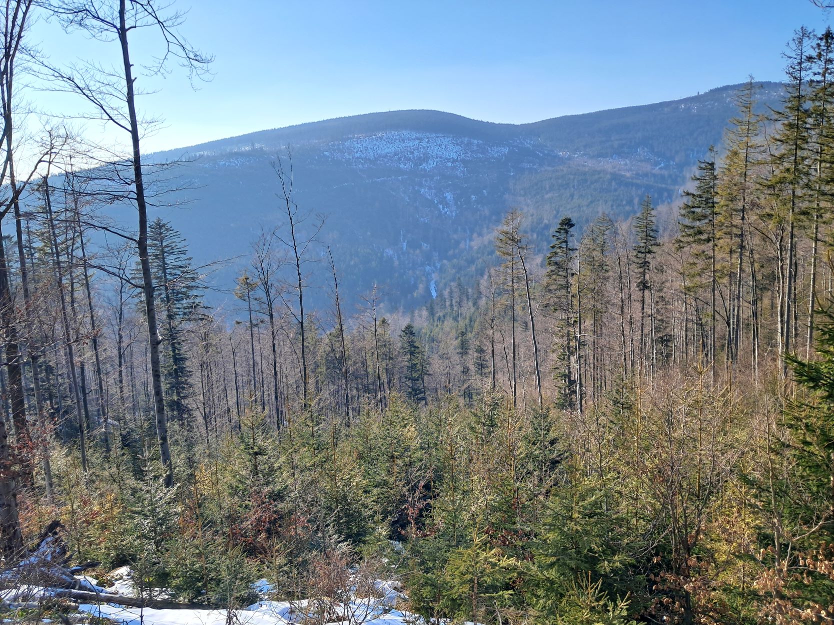 Naszą pętelkę zamykamy czarnym szlakiem prowadzącym spod schroniska na parking na Wielkiej Polanie. Początkowo szlak biegnie wspólnie z zielonym, który również schodzi do Sidziny przechodząc przez Halę Krupową. Ze szlaku widać ładnie Pasmo Policy z Czernicem, przełęczą i samą Policą oraz majaczące w oddali Tatry. Samo przejście momentami przypomina spacer szeroką aleją.