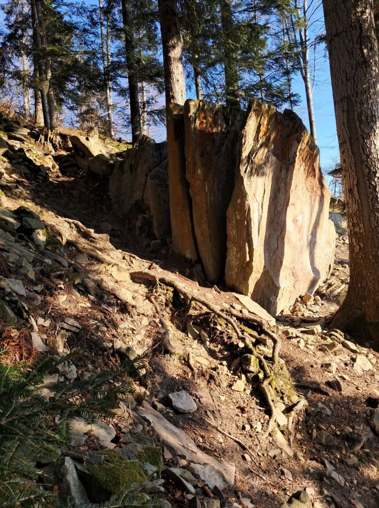 Pojedyncze płaty śniegu pozwalają na „przetarcie” butów z błota, a największą atrakcją zejścia okazuje się erozja fizyczna piaskowców, a dokładnie działanie zamrozu.