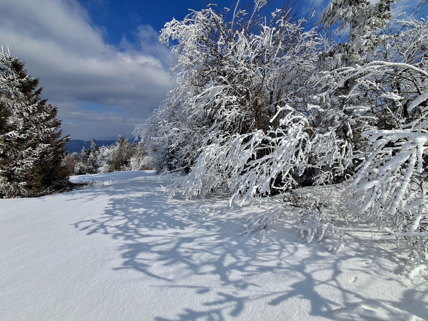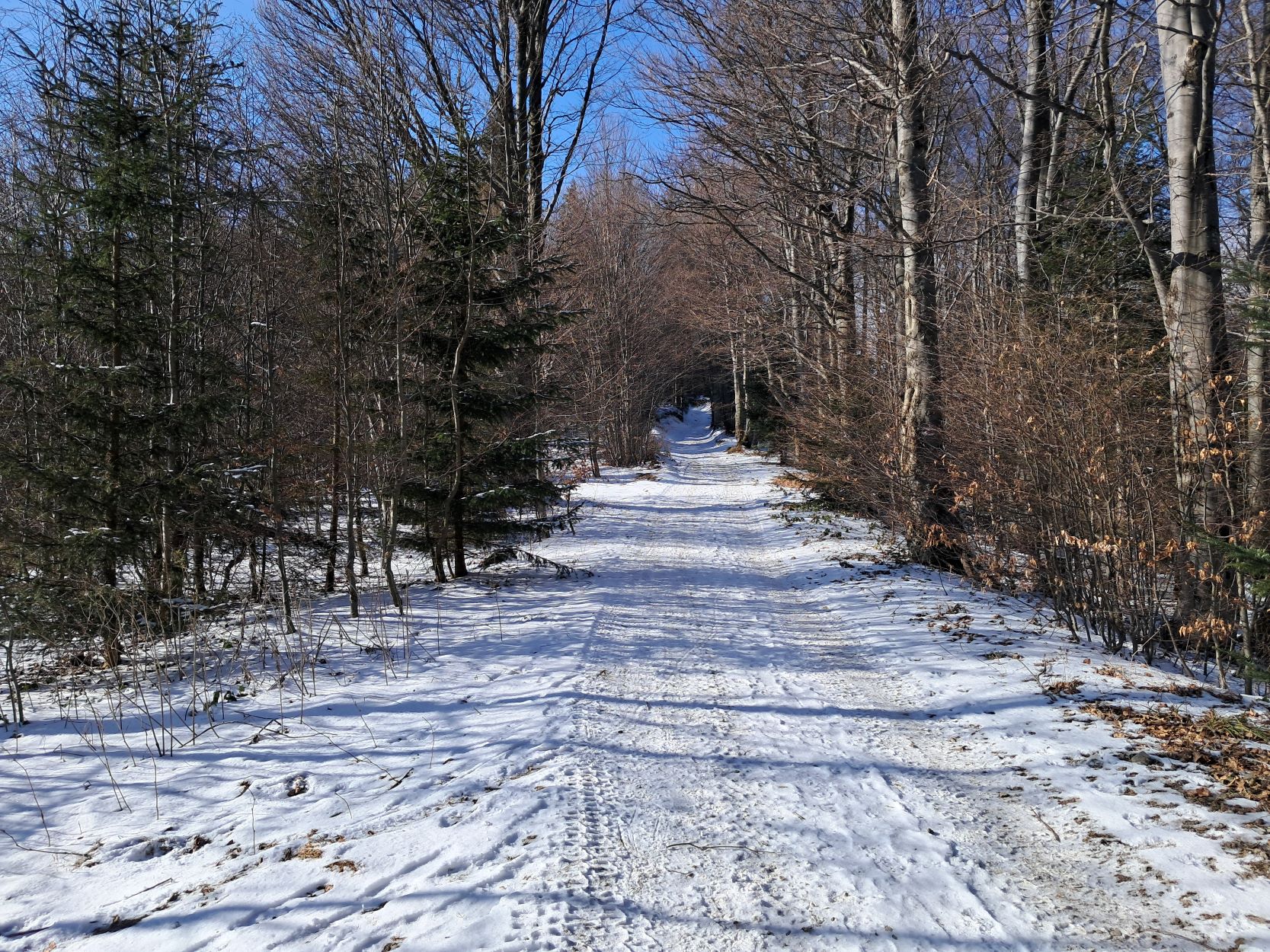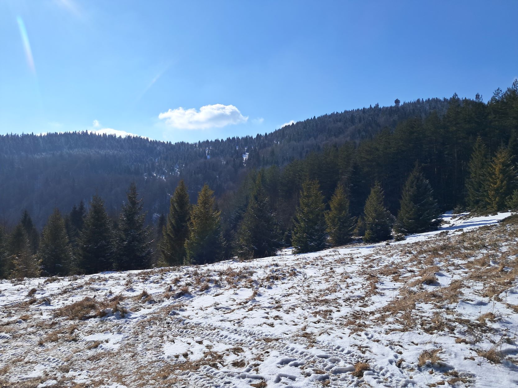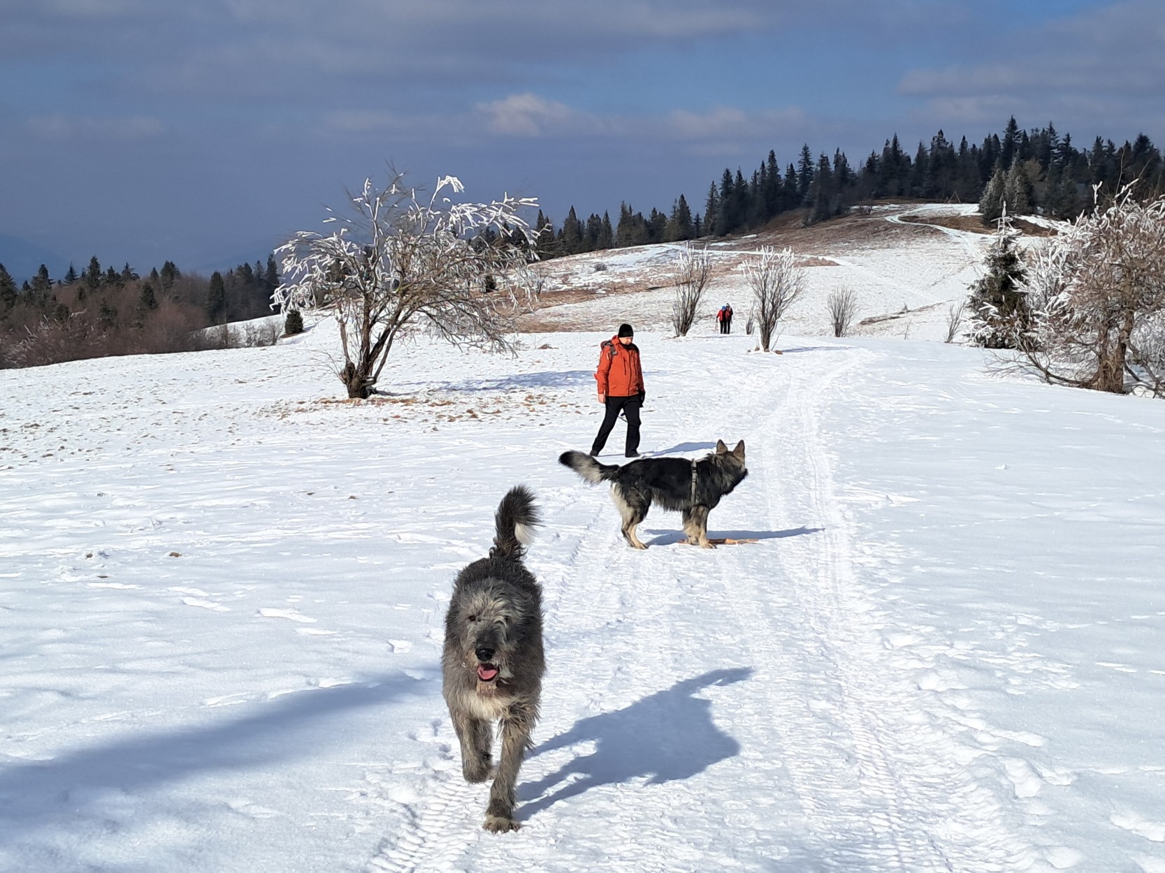 Po przejściu około 500 m przez las wychodzimy na niewielką polanę, z której roztacza się widok na Beskid Wyspowy, z królującą w oddali jego panią – Mogielicą (1171m.n.p.m.). Wraz z wysokością przybywa też coraz więcej śniegu, który radośnie skrzypi pod naszymi butami.