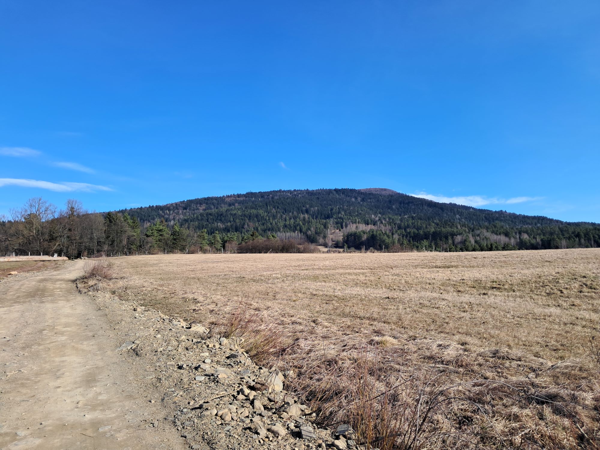 Spacer z Hugo zaczynam w Rabce Zaryte, gdzie zostawiam samochód na parkingu przy krajowej 28. Dosłownie parę metrów dalej jest wejście na zielony szlak, który poprowadzi nas na szczyt Lubonia Wielkiego. Po minięciu kilku domów, zza ogrodzeń których obszczekują nas psy, a właściwie Huga, wychodzimy na otwartą przestrzeń z widokiem na Luboń Wielki od południowej strony. Odwracając się – spoglądamy na Gorce.