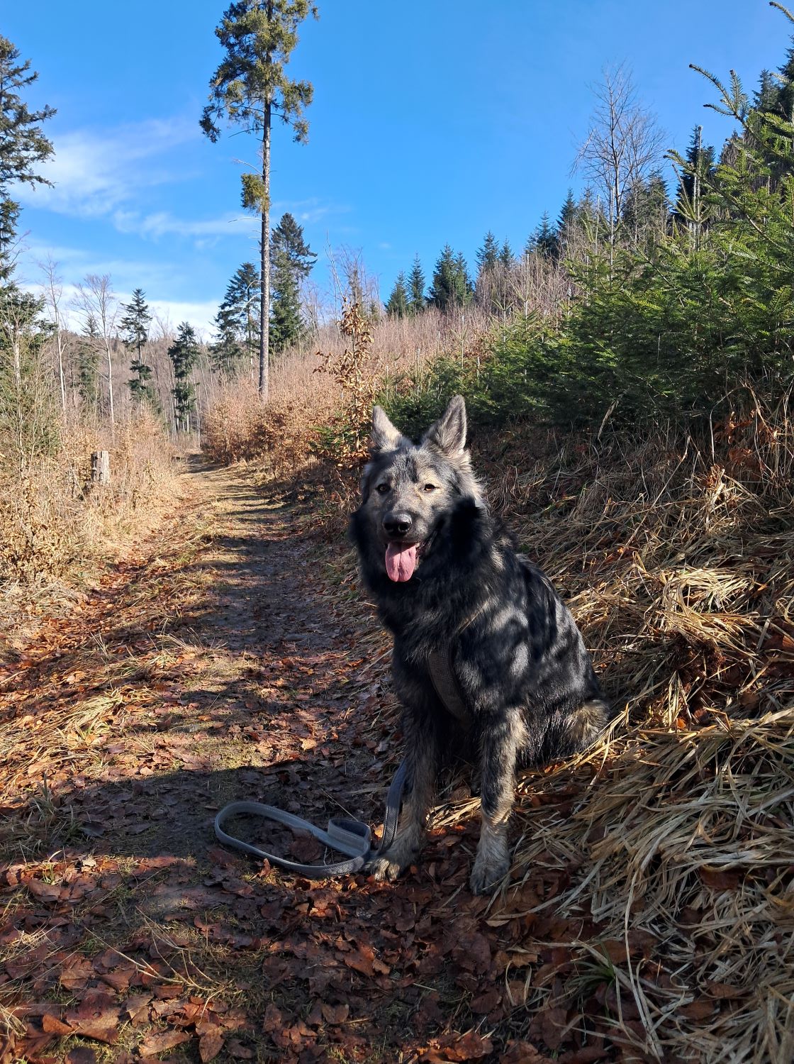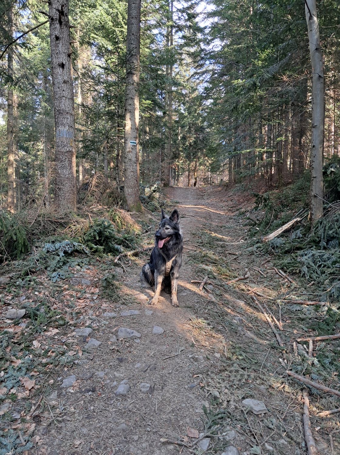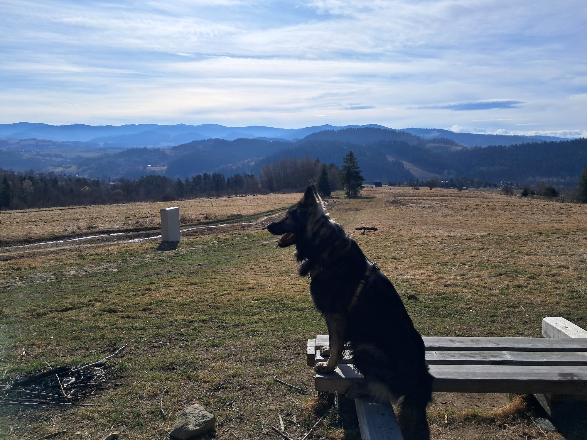 Wracam po Hugo, a ponieważ jesteśmy już w miejscu poniżej rezerwatu, legalnie możemy wejść na szlak żółty, którym pomału schodzimy na dół. Ścieżka podobnie, jak ta prowadzona szlakiem zielonym biegnie już teraz przez las, po wyjściu z którego roztacza się widok na Gorce.