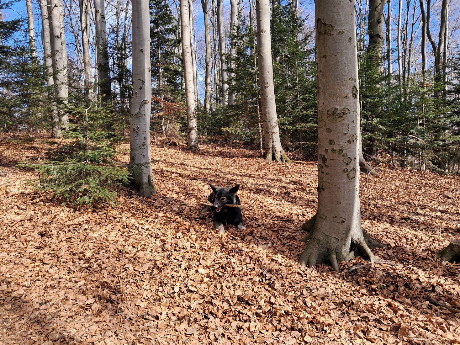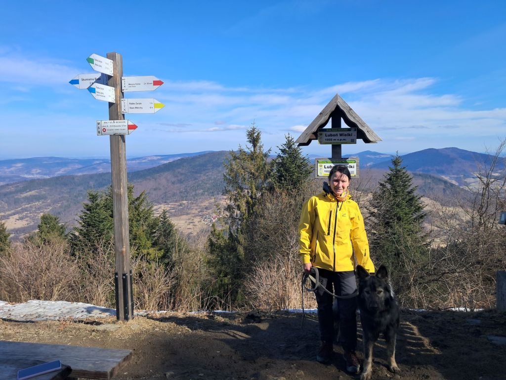 Poza zielonym i niebieskim szlakiem, od strony Rabki na Luboń można wejść jeszcze szlakiem żółtym, o którym parę słów za chwilkę oraz czerwonym z Przełęczy Glisne. Korzystamy z pięknej pogody, ja popijając kawę, Hugo przegryzając chrupy i obmyślam plan drogi powrotnej. A dlaczego?