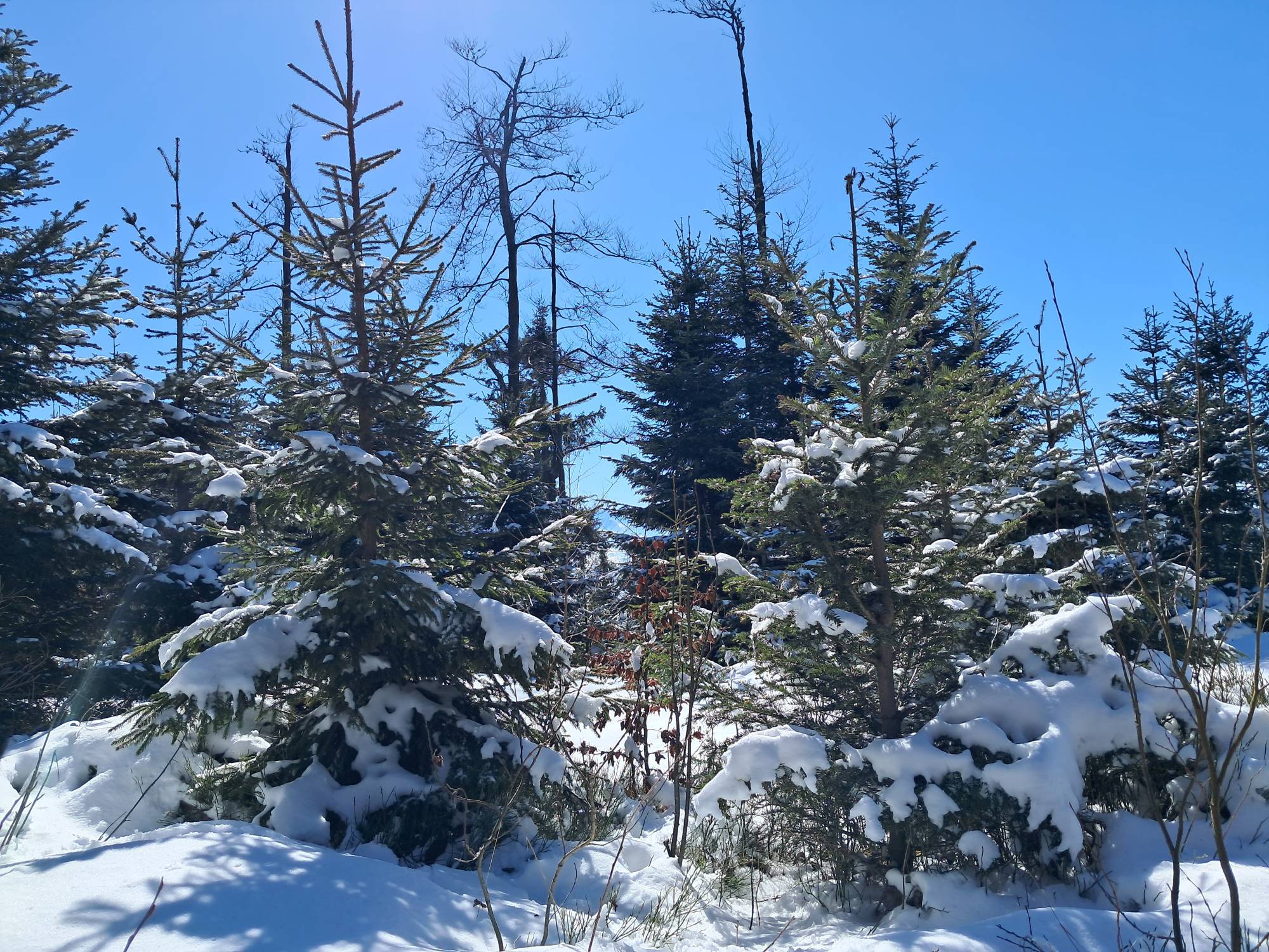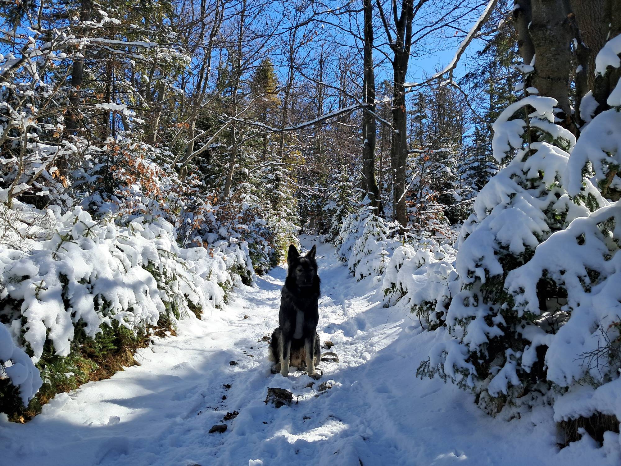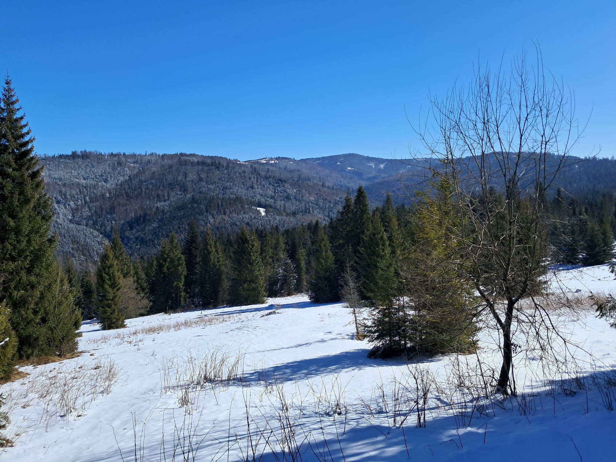 Ruszamy z Hugo z Obidowej zielonym szlakiem w stronę Bukowiny Obidowskiej. To praktycznie najbardziej stromy odcinek na całej trasie. Mnóstwo śniegu, leciutki mrozik i słońce. I cisza. Po przejściu niespełna 2km dochodzimy do Bukowiny Obidowskiej, gdzie jest skrzyżowanie z czarnym szlakiem prowadzącym z Klikuszowej w stronę Turbacza, a na który wchodzimy.