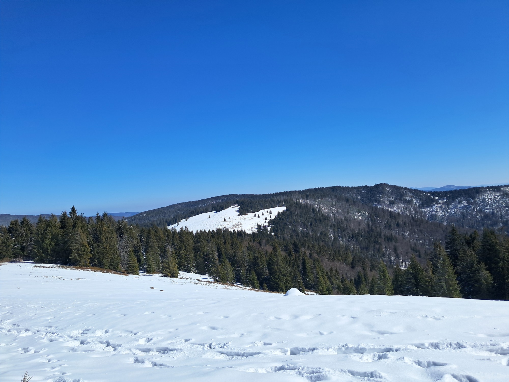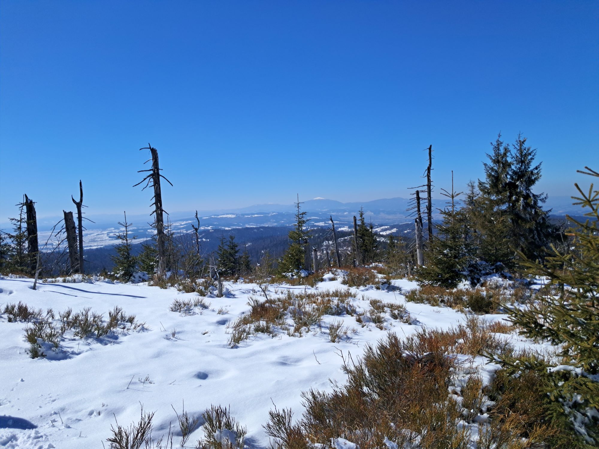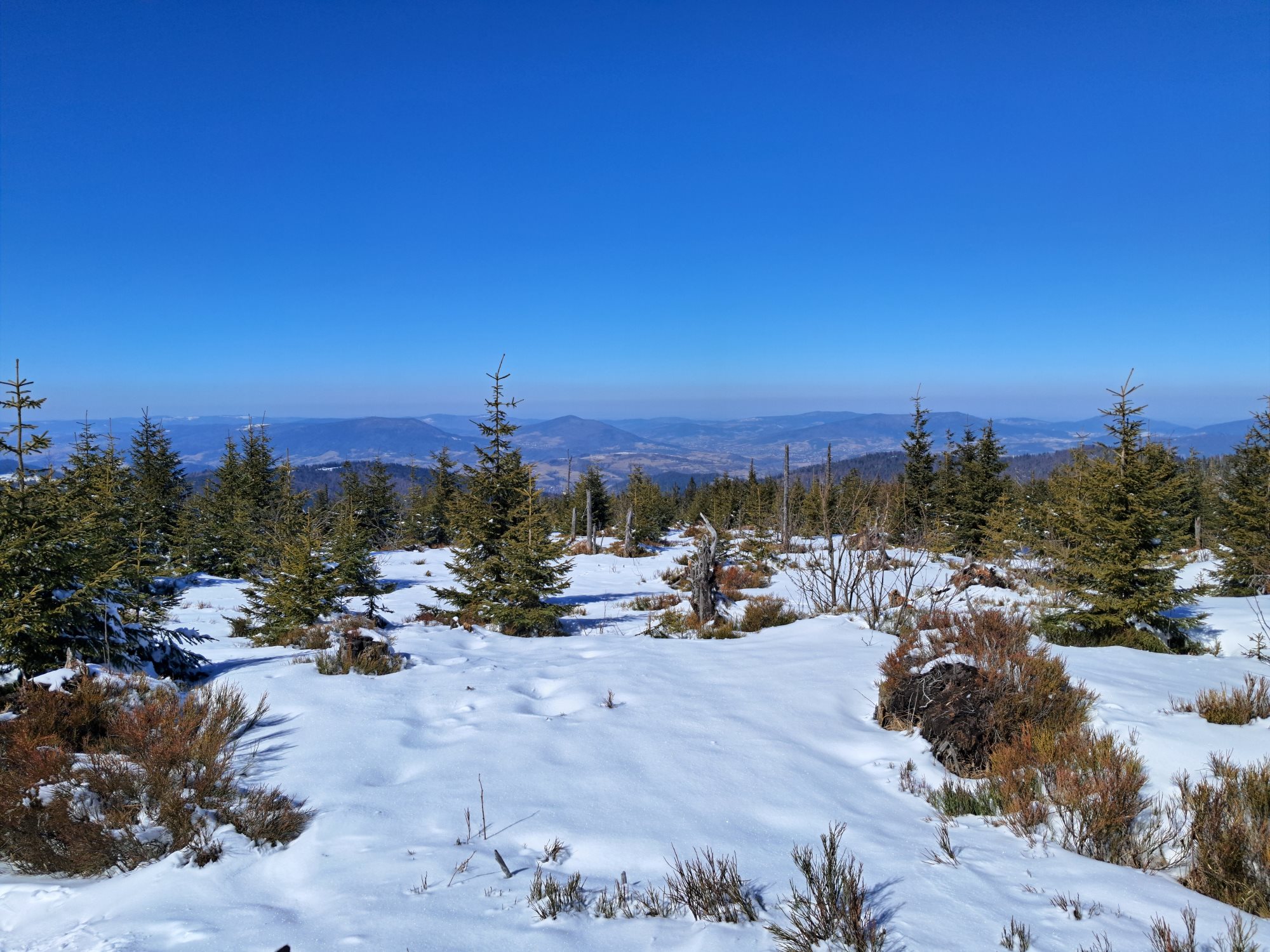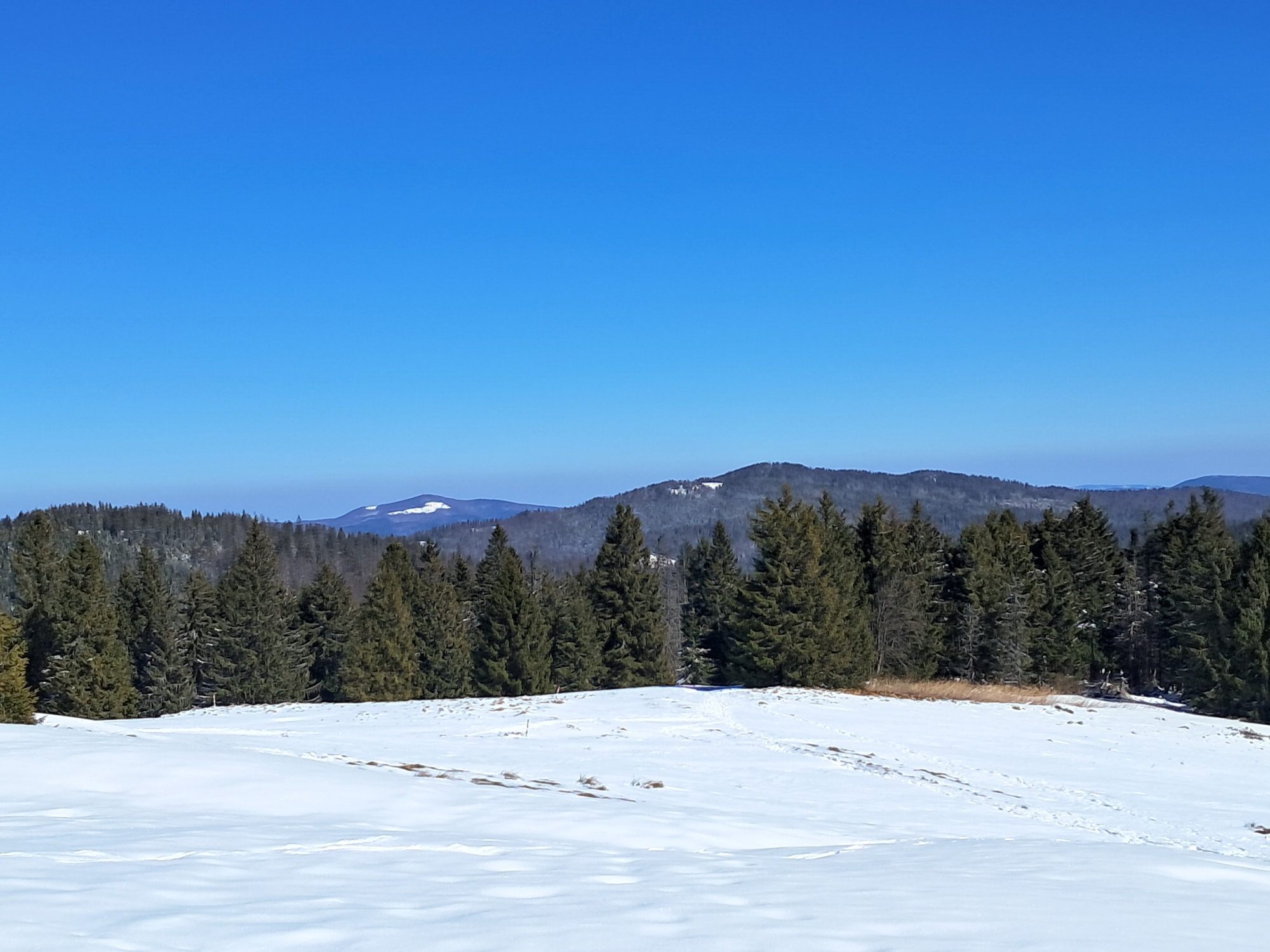 Ruszamy z Hugo z Obidowej zielonym szlakiem w stronę Bukowiny Obidowskiej. To praktycznie najbardziej stromy odcinek na całej trasie. Mnóstwo śniegu, leciutki mrozik i słońce. I cisza. Po przejściu niespełna 2km dochodzimy do Bukowiny Obidowskiej, gdzie jest skrzyżowanie z czarnym szlakiem prowadzącym z Klikuszowej w stronę Turbacza, a na który wchodzimy.