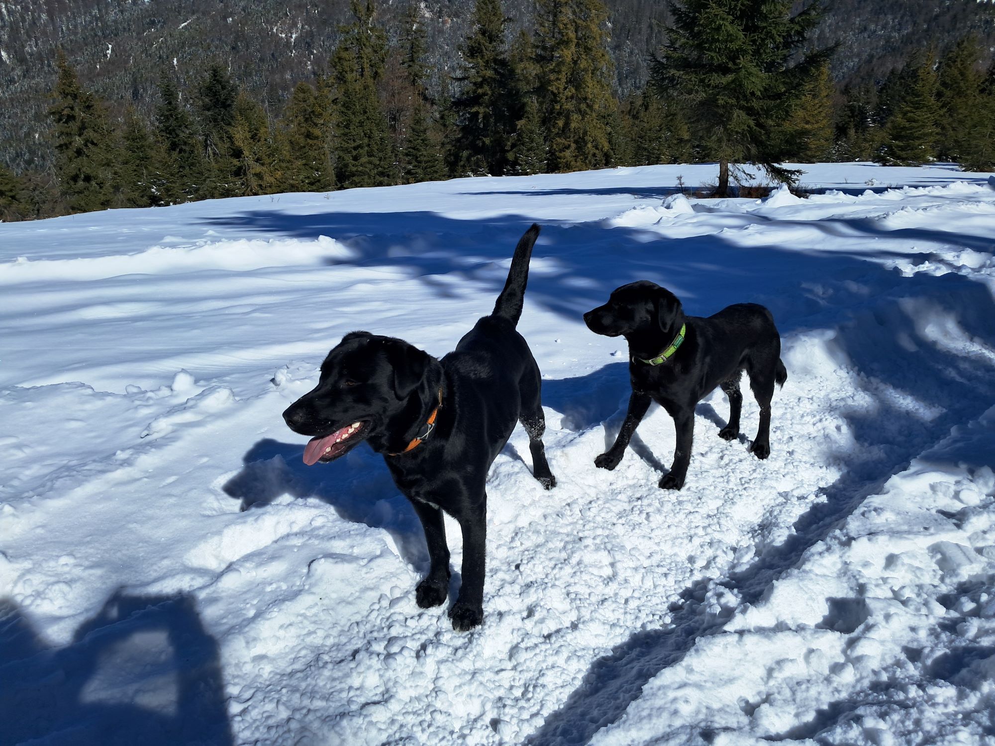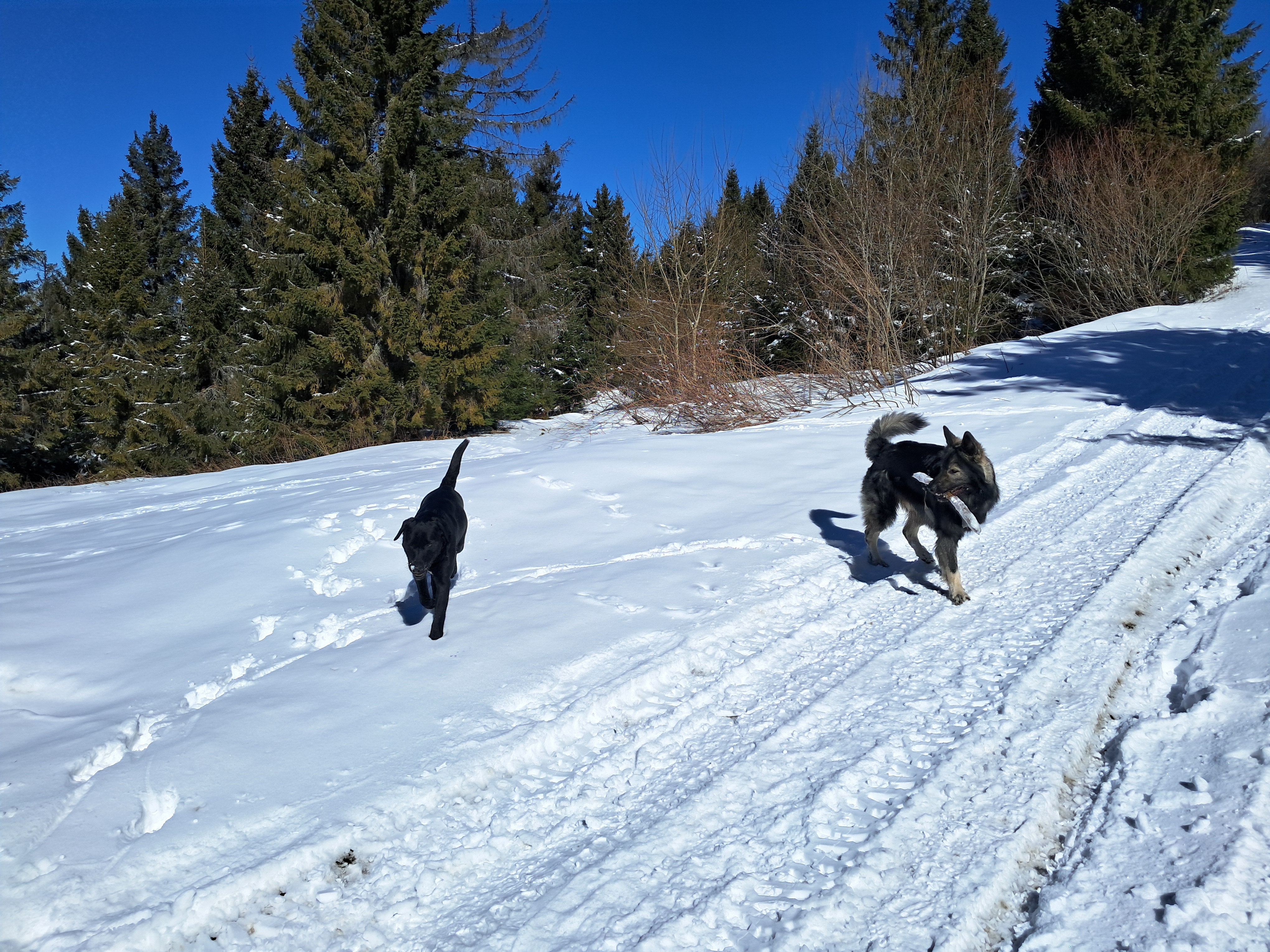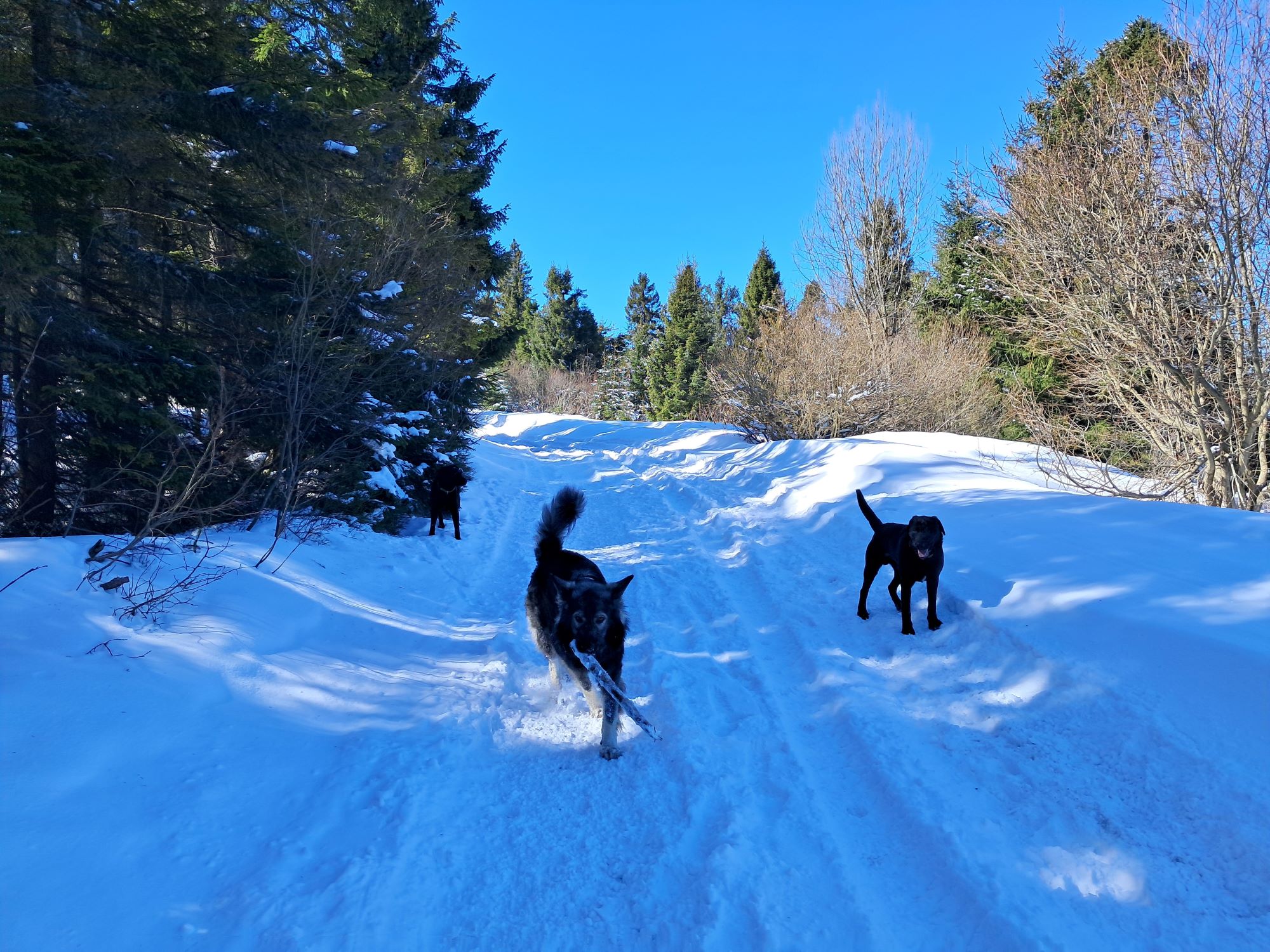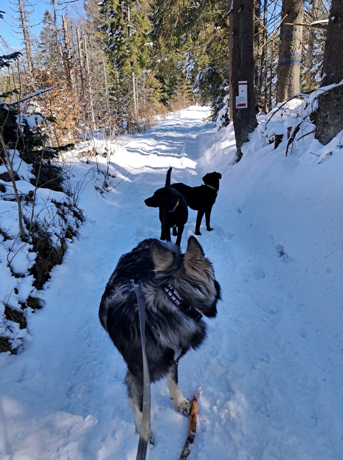 Praktycznie zaraz po wejściu na żółty szlak, którym podążać będziemy jeszcze 3,5km z naprzeciwka nadbiegają dwa radosne pieski w typie labradora. Hugo na ich widok nie jest aż tak radosny, a ja desperacko wypatruję opiekunów. Bez skutku. Pieski mają obroże, wyglądają na zadbane. Po upływie paru minut, w czasie których Hugo ustawił towarzystwo, jedyne co przychodzi mi na myśl to opublikować post na jednej z grup FB. Psiaki mają coś na obrożach, ale nie mam szans zbliżyć się do nich w obecności Huga. Tak więc, ruszam z trójką psów do schroniska licząc, że może tam znajdziemy właścicieli.