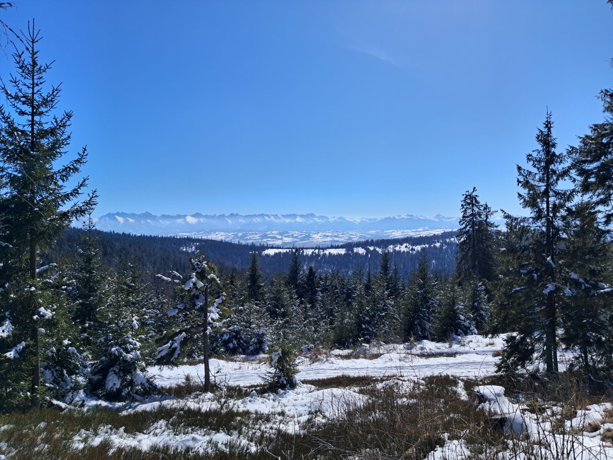 Zatrzymujemy się na chwilkę na Długich Młakach, by podziwiać panoramę Tatr. Tu też dochodzą szlaki: zielony z Długiej Polany, czarny z Ostrowska i niebieski prowadzący z Łopusznej.