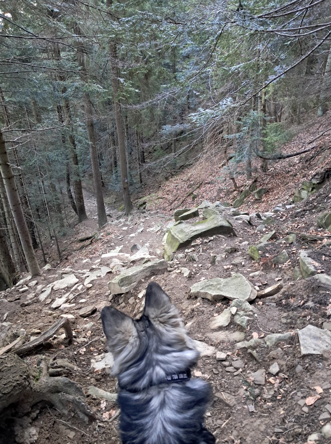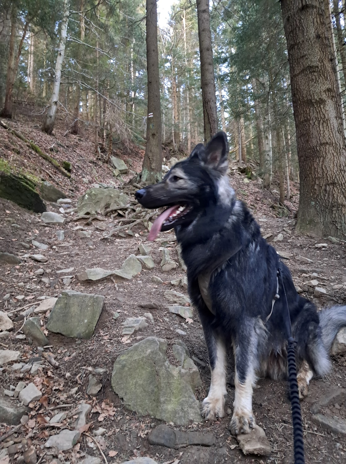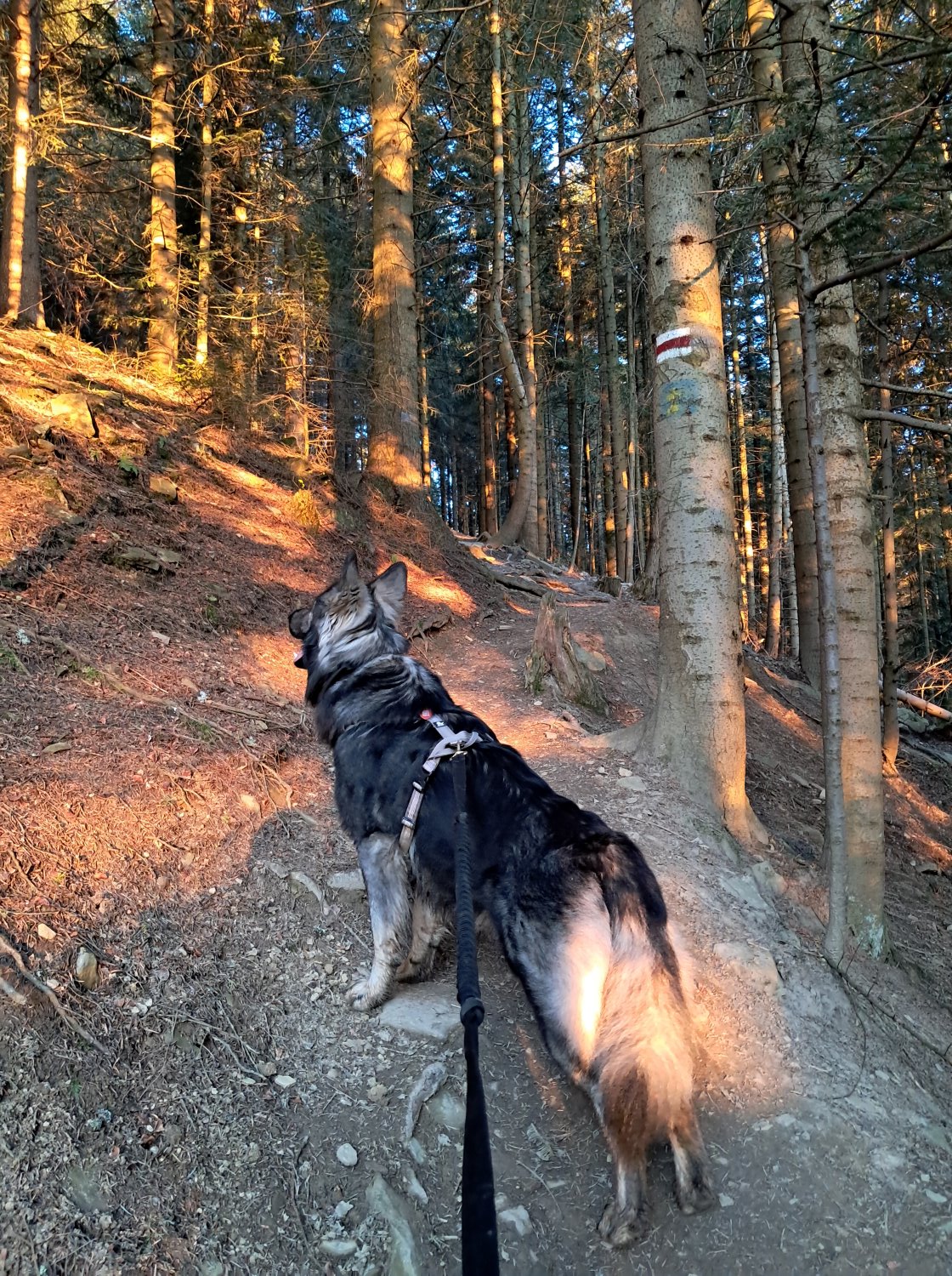 Tak więc, skręcamy w lewo na szlak czerwony. Miejscami jest on naprawdę stromy, jak na beskidzkie trasy i idąc z psem na smyczy trzeba uważać. Hugo jest już zaprawiony w bojach, a dzięki nauce posłuszeństwa idzie nam się wyśmienicie. Niemniej osoby, które zaczynają dopiero wędrówki w psami lub pieski mają „tendencję” do ciągnięcia na smyczy warto rozważyć wejście na Luboń innym szlakiem, z Rabki lub od strony Naprawy.