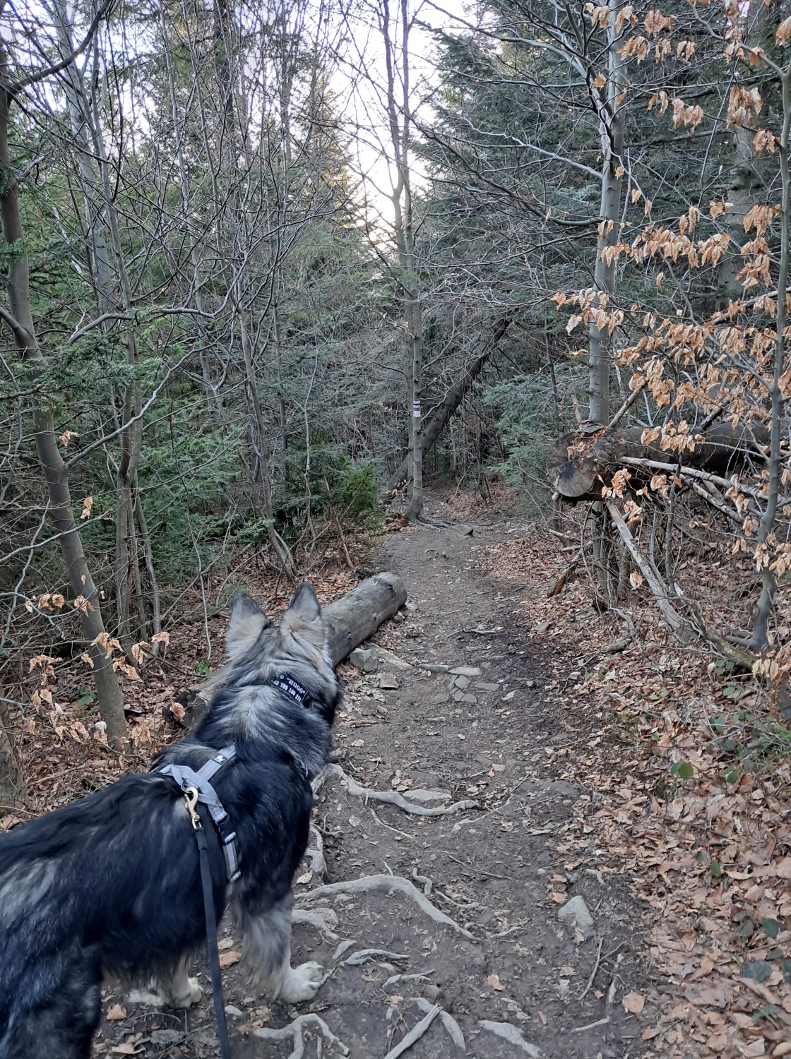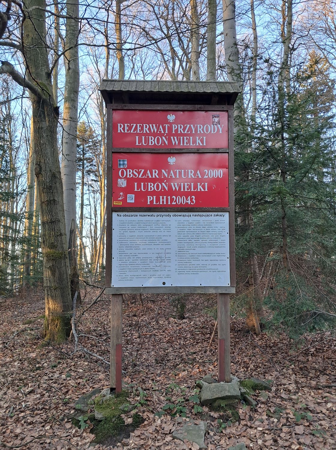 Stromszy odcinek trasy prowadzi aż do Skrzyżowania na Luboniu, gdzie czerwony szlak łączy się z żółtym prowadzącym z Rabki-Zaryte przez Rezerwat Przyrody Luboń Wielki, tzw. Perć Borkowskiego. Więcej na ten temat znajduje się w moim wcześniejszym wpisie https://psyjazne.com/2025/03/12/poranny-spacer-na-lubon-wielki/ Od tego miejsca na szczyt już niespełna 200m prostą, szeroką ścieżką.