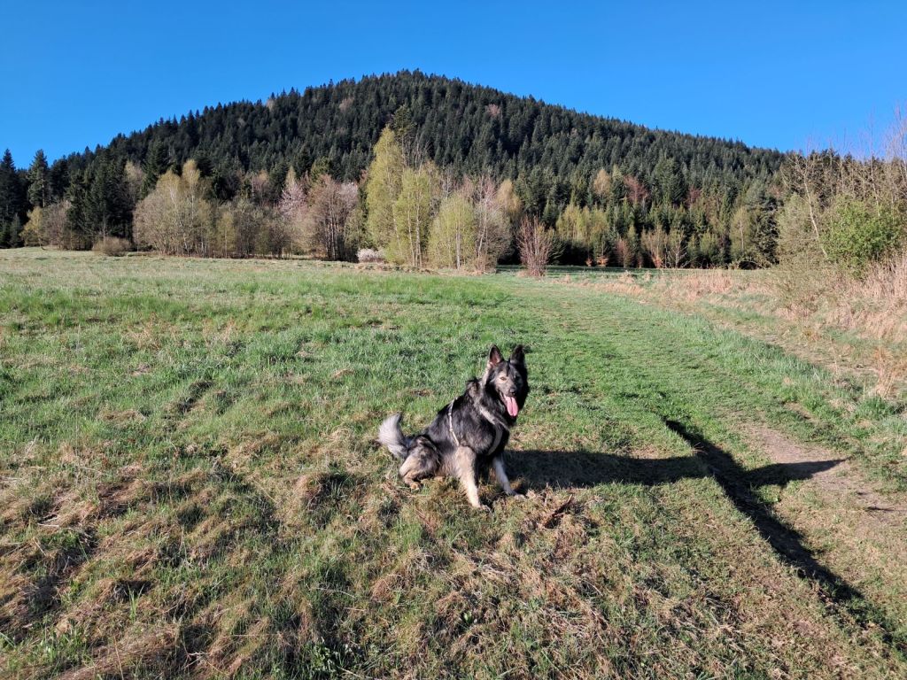 Po pokonaniu trudniejszego odcinka docieramy na rozległe łąki, na których Hugo może się wybiegać do woli 🙂