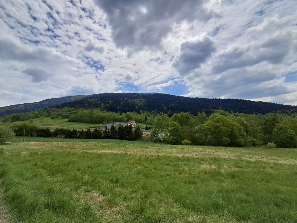 Pierwsze 400m pokonujemy drogą asfaltową prowadzącą do znajdujących się tu domów, a jedyną atrakcją jest widok na górujący nad Przełęczą Gruszowiec Ćwilin.