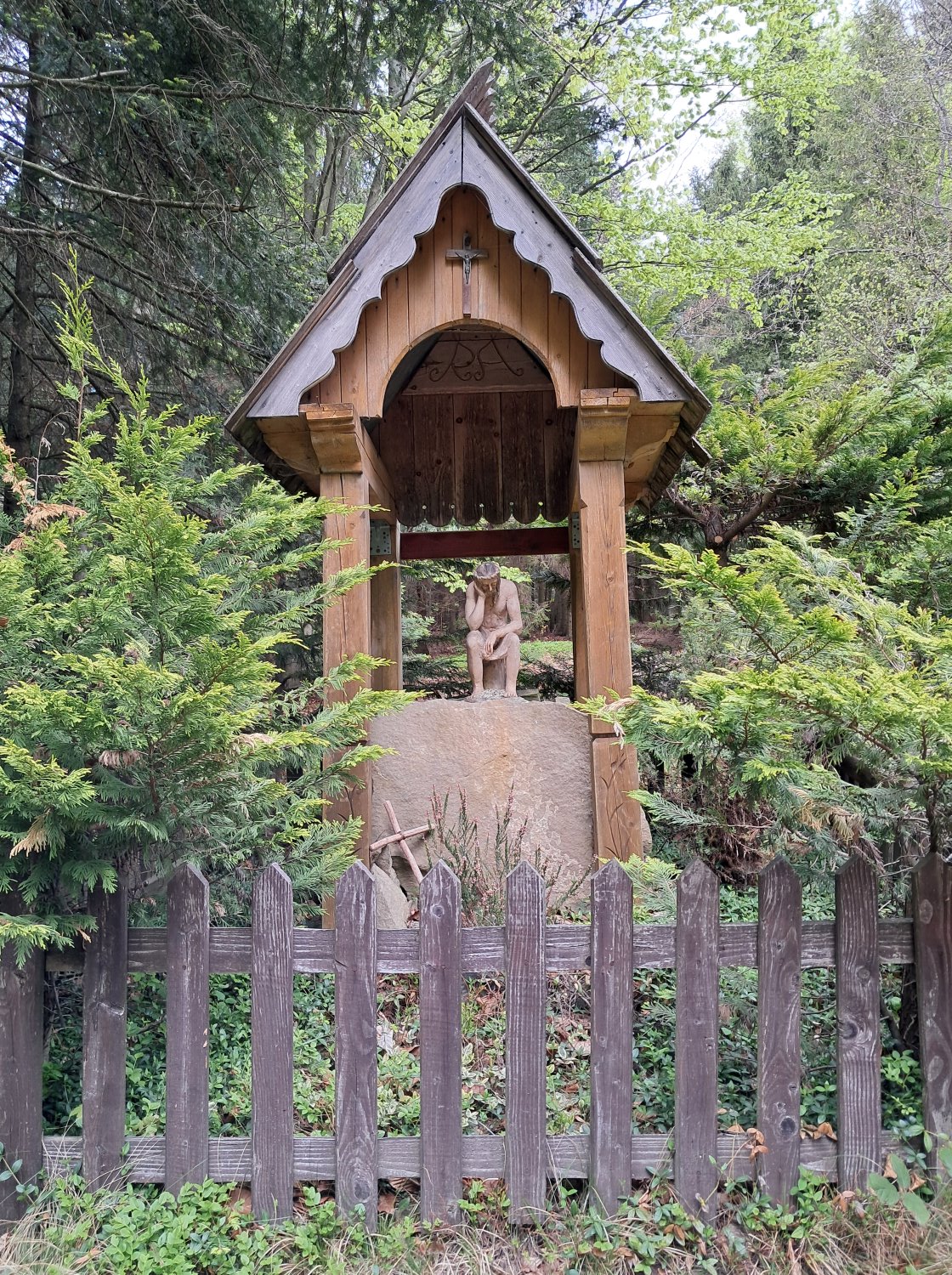 Po przejściu kilometra od Przełęczy następuje rozejście szlaków. Krótszy niebieski prowadzący bezpośrednio na szczyt Śnieżnicy zostawiamy sobie do zejścia, teraz wybieramy zielony, ciut dłuższy. Idąc nim mijamy figurkę Chrystusa Frasobliwego, Młodzieżowy Ośrodek Rekolekcyjno-Rekreacyjny oraz tabliczkę informującą, że zbliżamy się do schroniska – górnej stacji wyciągu narciarskiego Kasina SKI.