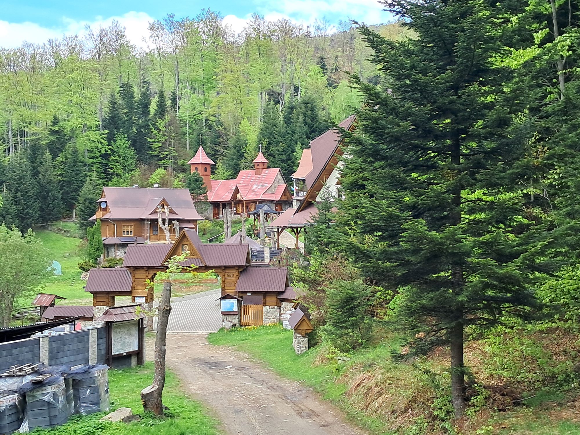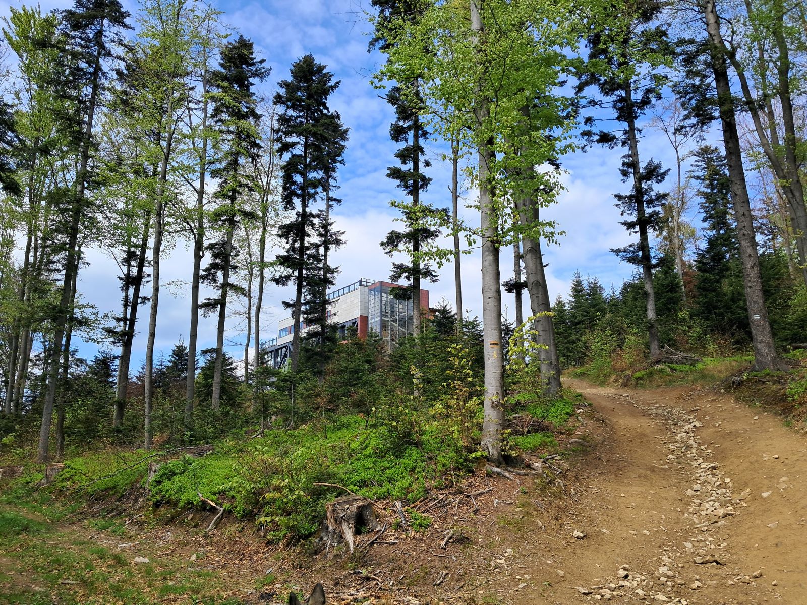 Ścieżka biegnie przez piękny, budzący się po zimie bukowy las wychodząc wprost do nieczynnej już teraz stacji narciarskiej. A szkoda, bo mieliśmy ochotę na kawę na tarasie widokowym…