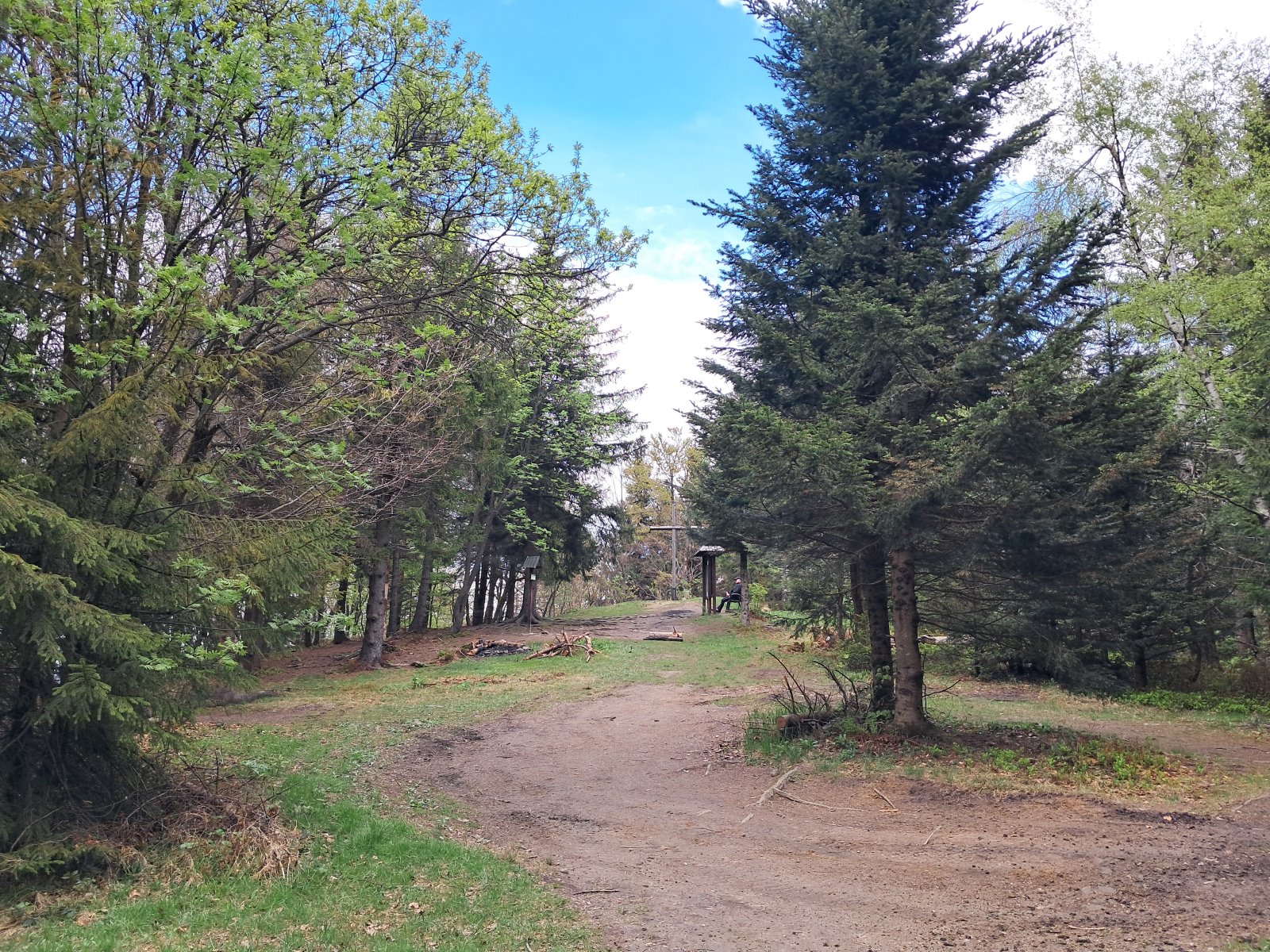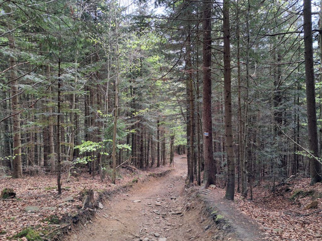 Szlak prowadzi nas leniwie szeroką aleją przez las na równie szeroki i zalesiony szczyt.