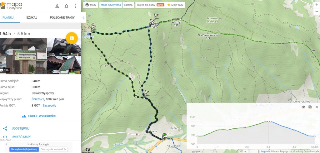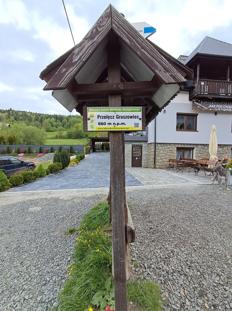 Dzisiejszy spacer rozpoczynamy i kończymy na Przełęczy Gruszowiec, przez którą biegnie dział wodny między dorzeczami Raby i Dunajca. Znajduje się tu pomnik upamiętniający mieszkańców Gruszowca pomordowanych w czasie pacyfikacji wsi w 1944r. oraz Bar pod Cyckiem, przy którym zostawiamy samochód. Z Przełęczy prowadzi niebieski szlak przez Ćwilin do Jurkowa oraz szlaki: niebieski i zielony biegnące na Śnieżnicę. I te wybieramy, a cała trasa wyniesie raptem 5,5 km. To naprawdę będzie szybki spacer😉
