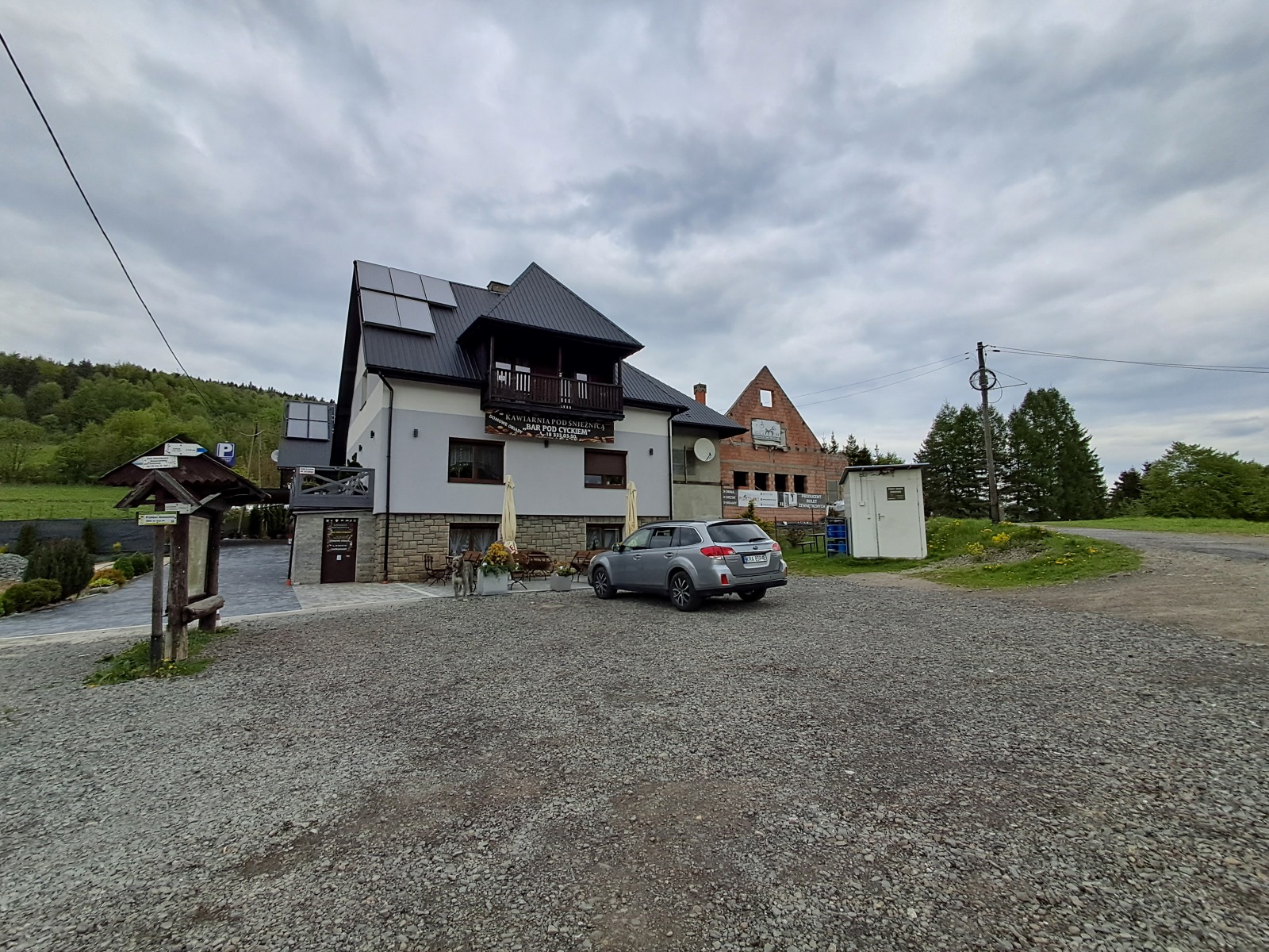 Po przejściu 2km jesteśmy znów na Przełęczy, przy Barze pod Cyckiem. Jest pora obiadowa, więc nie zastanawiając się długo, postanawiamy zamówić coś do jedzenia tym bardziej, że do środka możemy wejść z psami🙂