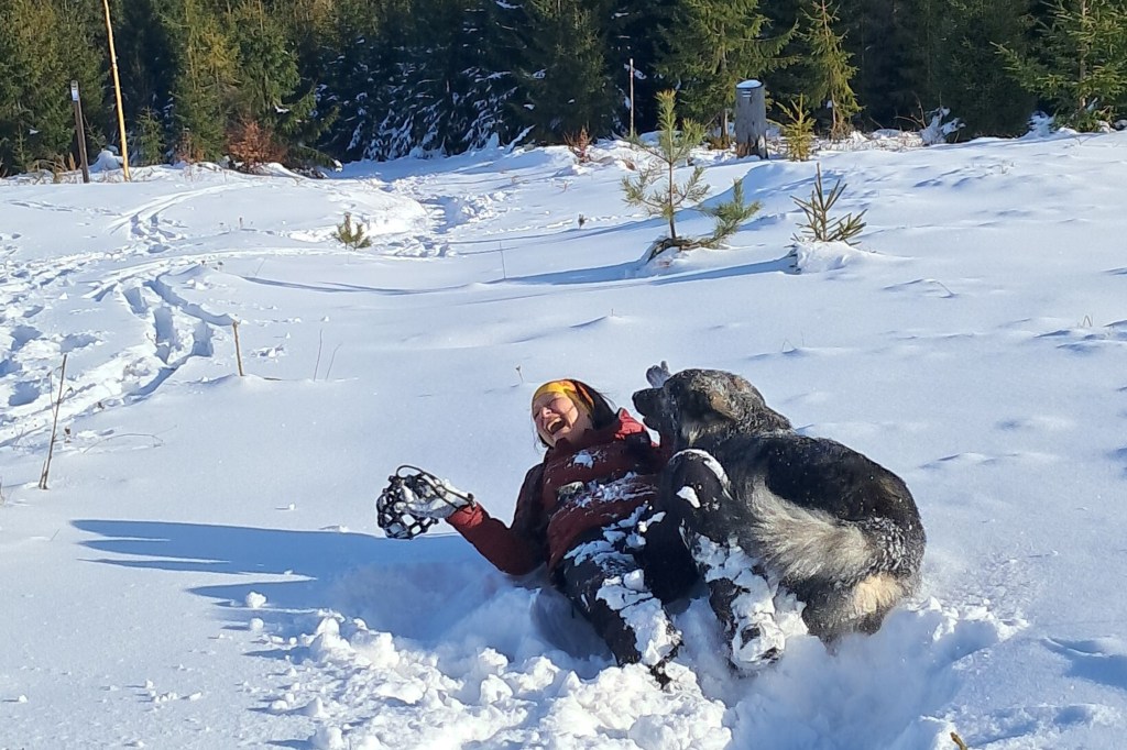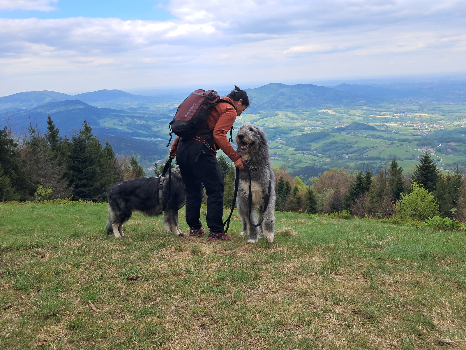 Przede wszystkim bagaż dobrego humoru. Poza tym wygodne buty i równie wygodny ubiór dopasowany do pory roku i warunków atmosferycznych. Obowiązkowa jest mapa i ewentualnie aplikacja. Mapę rozłożę zawsze, nie muszę się martwić o zasięg😉 Poza tym to, co zawsze się bierze na wycieczki. Woda z elektrolitami w ciepłe dni, herbata, np. korzenna w termosie w dni chłodniejsze, kanapki, żele energetyczne, etc. Co, kto lubi. Raczki turystyczne, gdy wędrujemy po śniegu i lodzie, kijki trekkingowe, podstawowa apteczka. A dla psa? Również woda z elektrolitami (można nabyć w sklepach zoologicznych), wysokoenergetyczne przekąski, które nazywamy z Mężem „kulkami mocy”, także podstawowa apteczka oraz książeczka zdrowia lub paszport z aktualnymi szczepieniami. I najważniejsza rzecz, która połączy nas z psiakiem: szelki i smycz. Tu warto zainwestować w wygodne szelki trekkingowe, które nie będą krępować psich ruchów i porządną, mocną smycz.