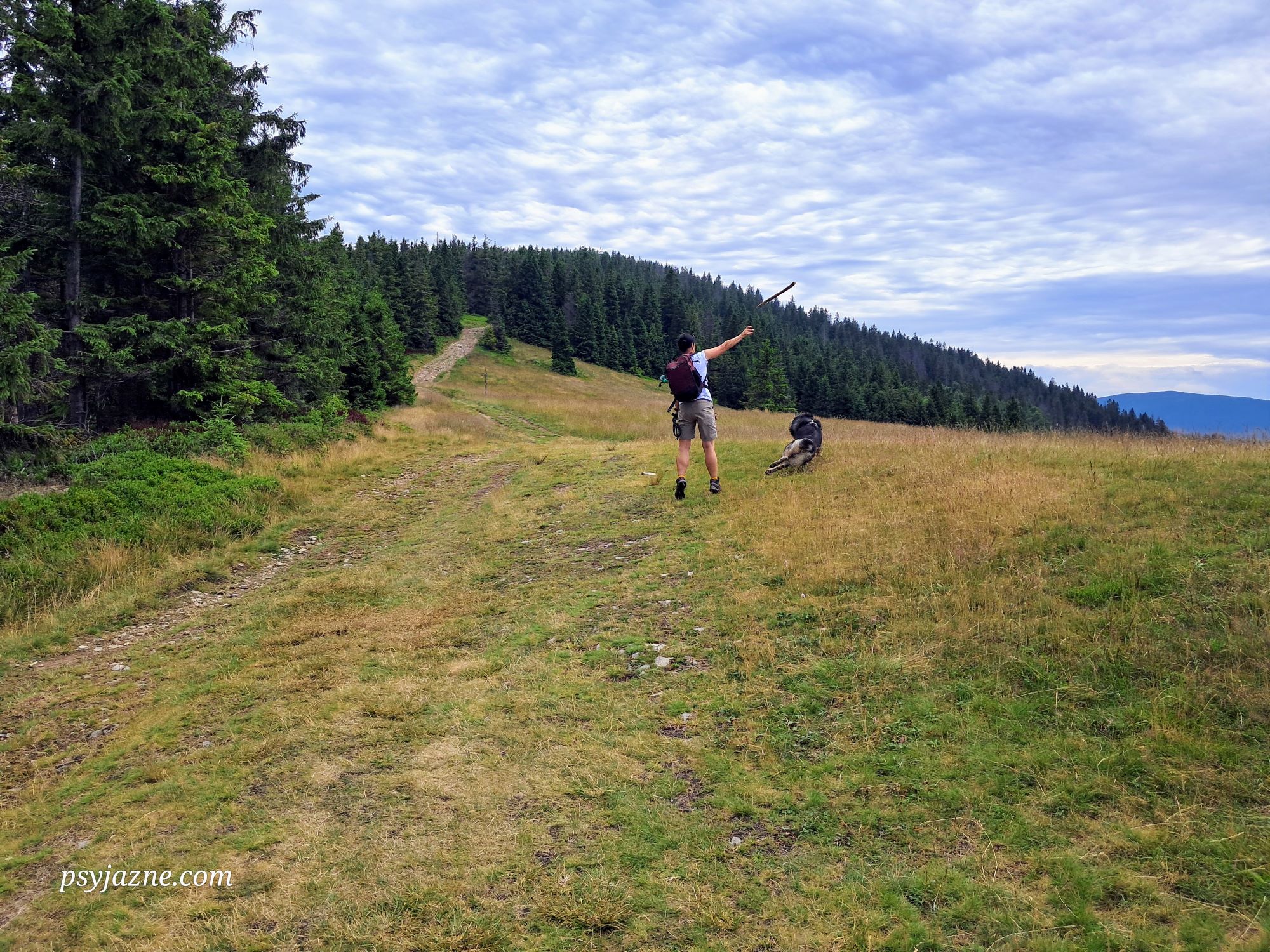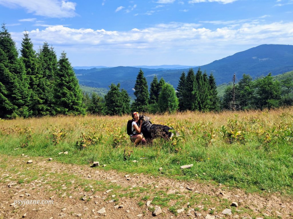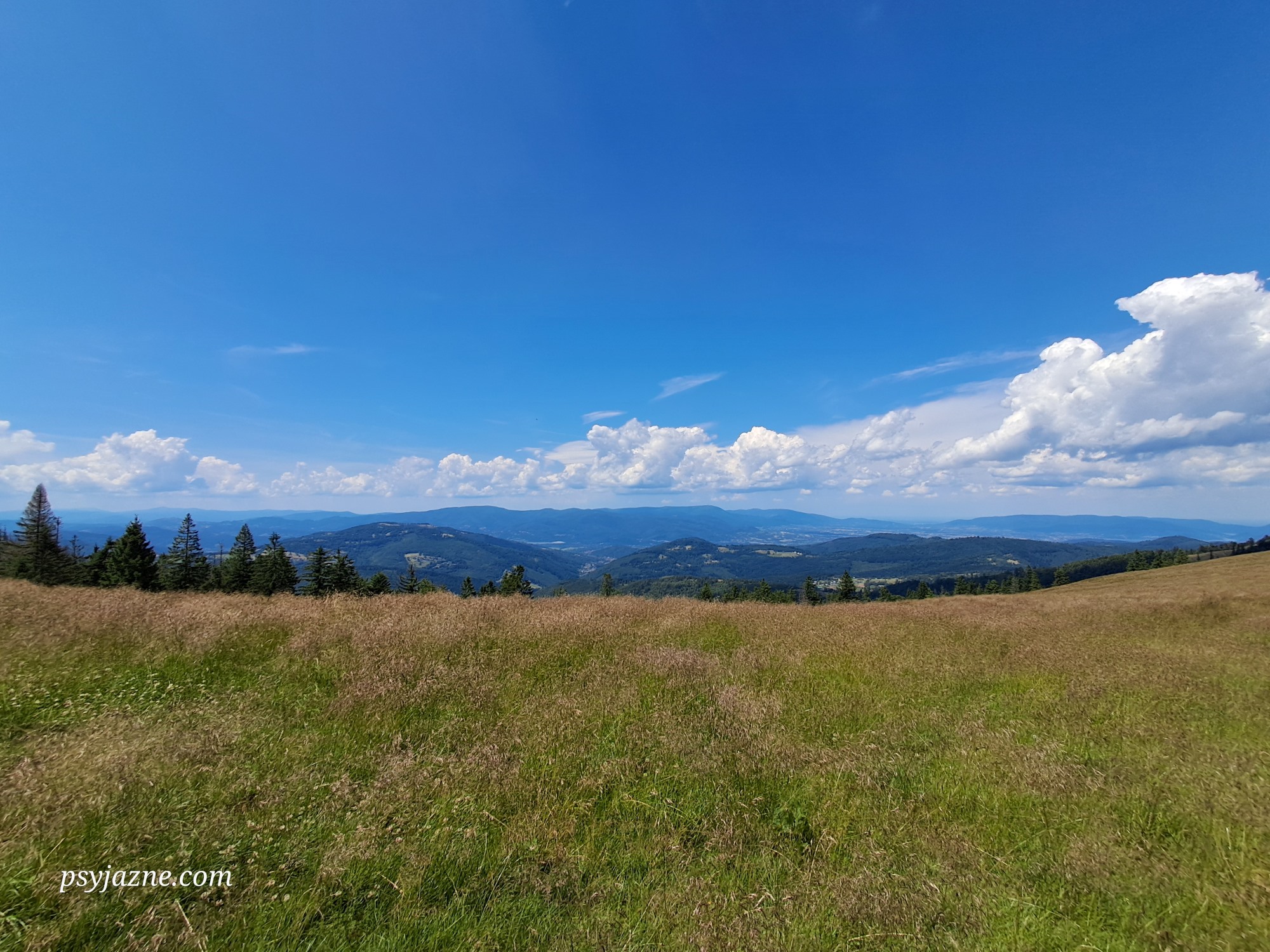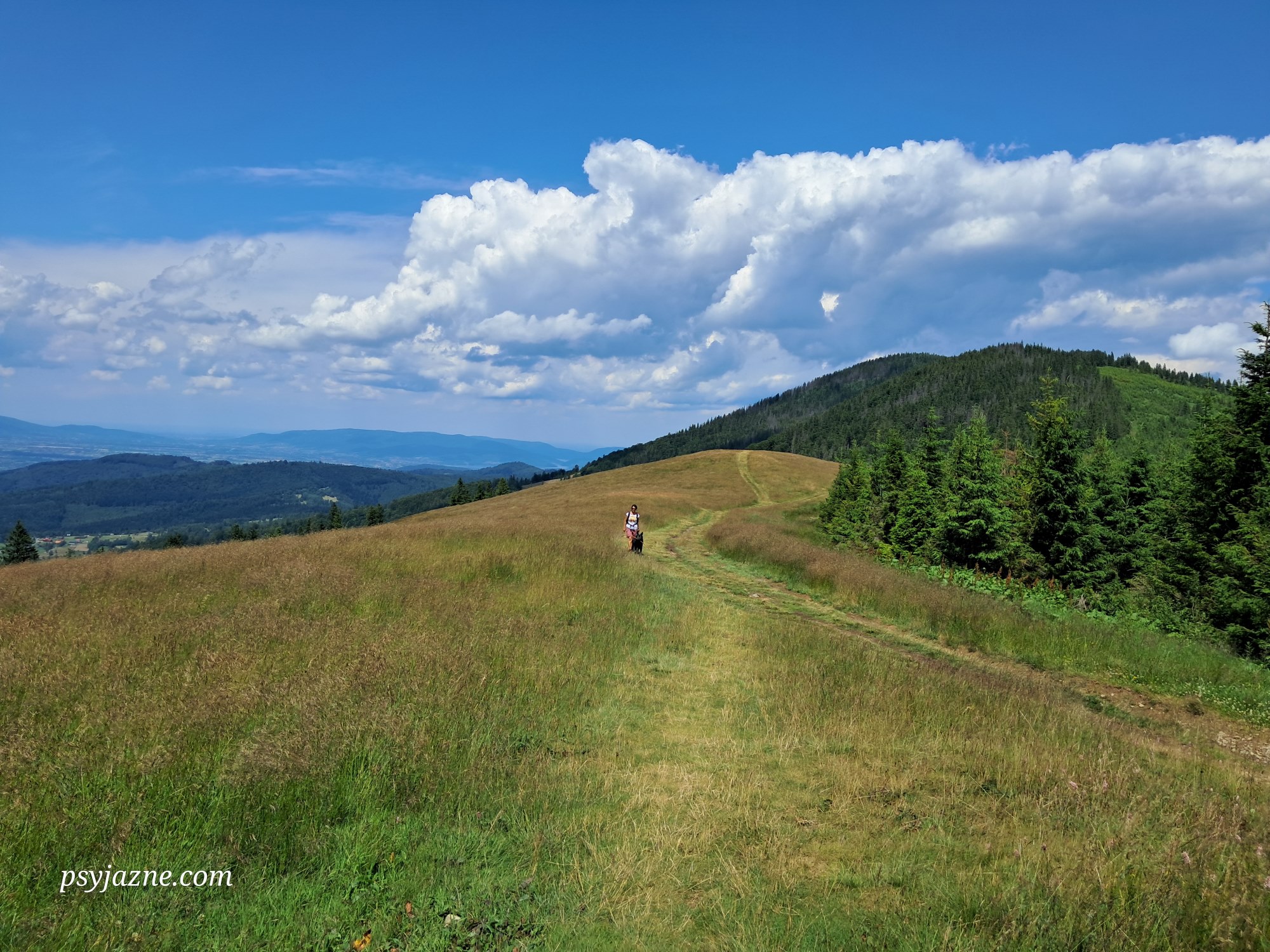 Rozsiadamy się wygodnie na trawie, by nie tylko rozkoszować się widokami, które zapierają dech w piersiach, ale by też pobawić się z Hugo, który pomimo przejścia 10km w upalno-tropikalną pogodę, wystrojony w futro, ma niewyczerpane pokłady energii. A podziwiać możemy między innymi masywy Pilska i Babiej Góry, a także majaczące w oddali tatrzańskie szczyty i Małą Fatrę.