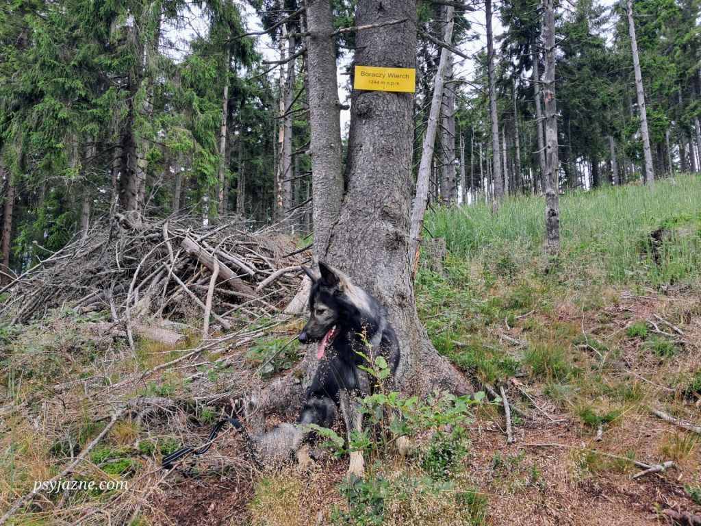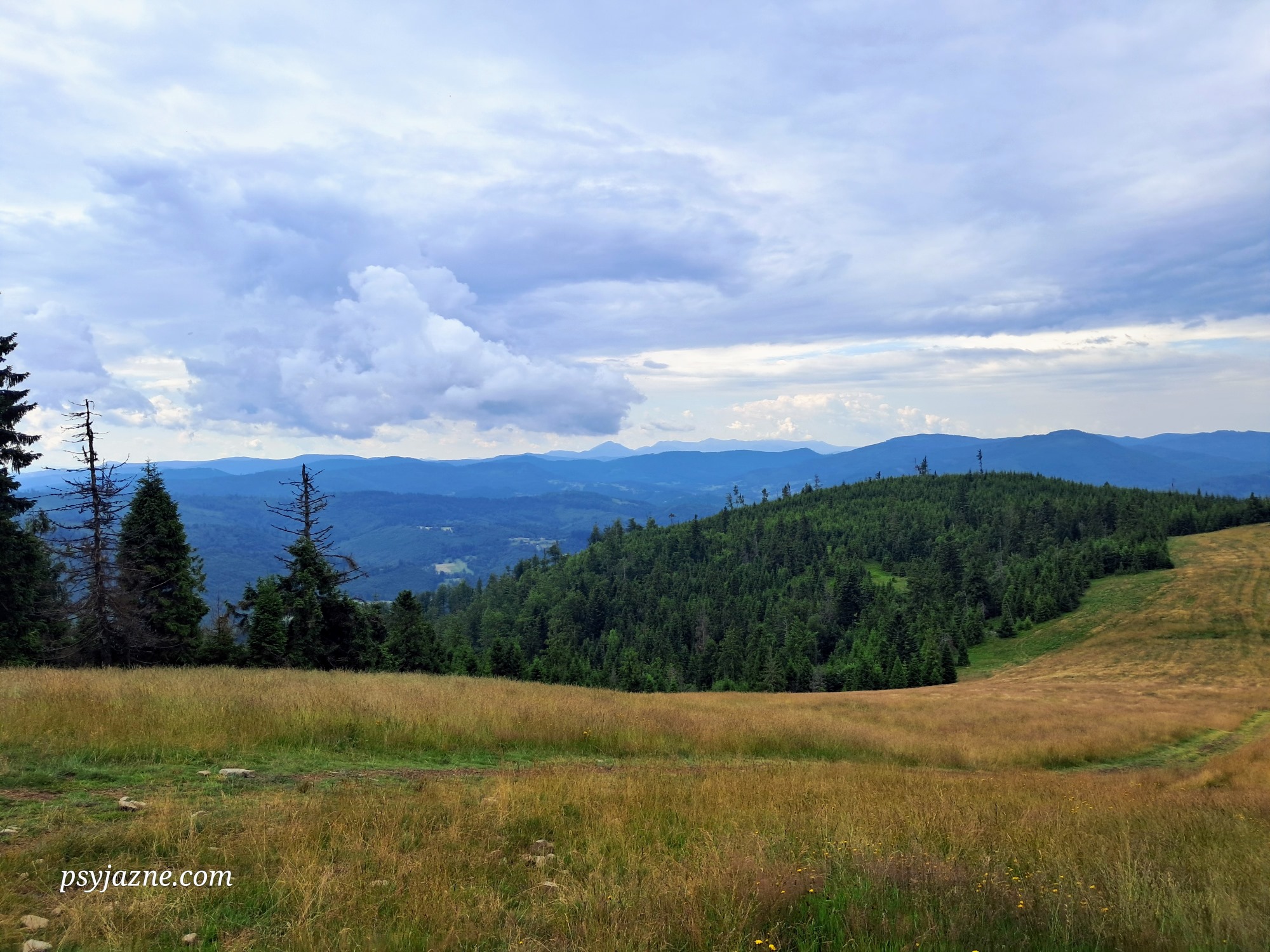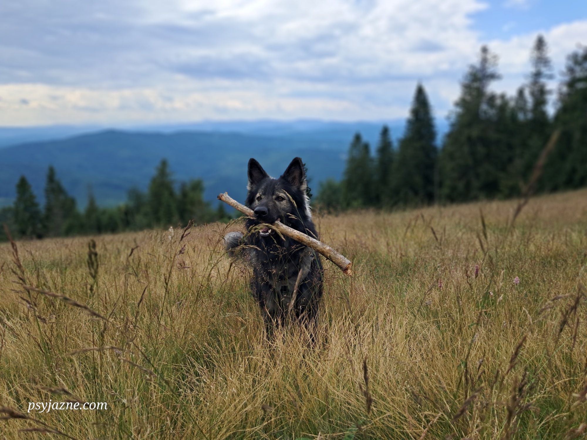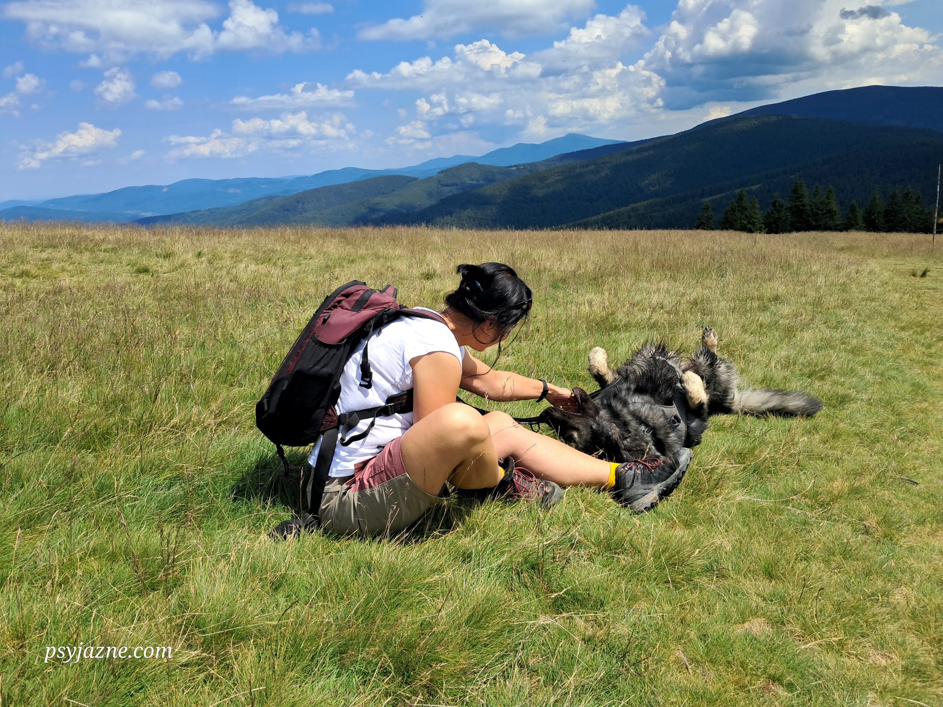 Rozsiadamy się wygodnie na trawie, by nie tylko rozkoszować się widokami, które zapierają dech w piersiach, ale by też pobawić się z Hugo, który pomimo przejścia 10km w upalno-tropikalną pogodę, wystrojony w futro, ma niewyczerpane pokłady energii. A podziwiać możemy między innymi masywy Pilska i Babiej Góry, a także majaczące w oddali tatrzańskie szczyty i Małą Fatrę.