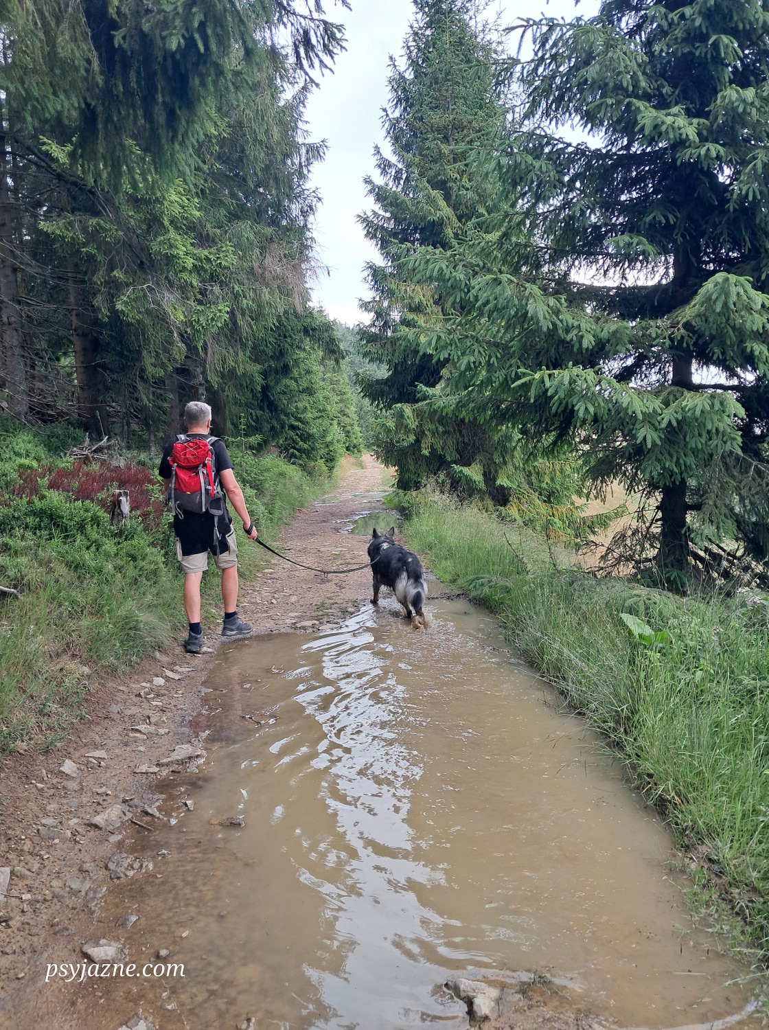 Na szczęście dla Huga, ścieżka jest jeszcze mokra po wcześniejszych deszczach i pełna licznych strużek, w których może zmoczyć i schłodzić łapki, a także chlipnąć źródlanej wody.