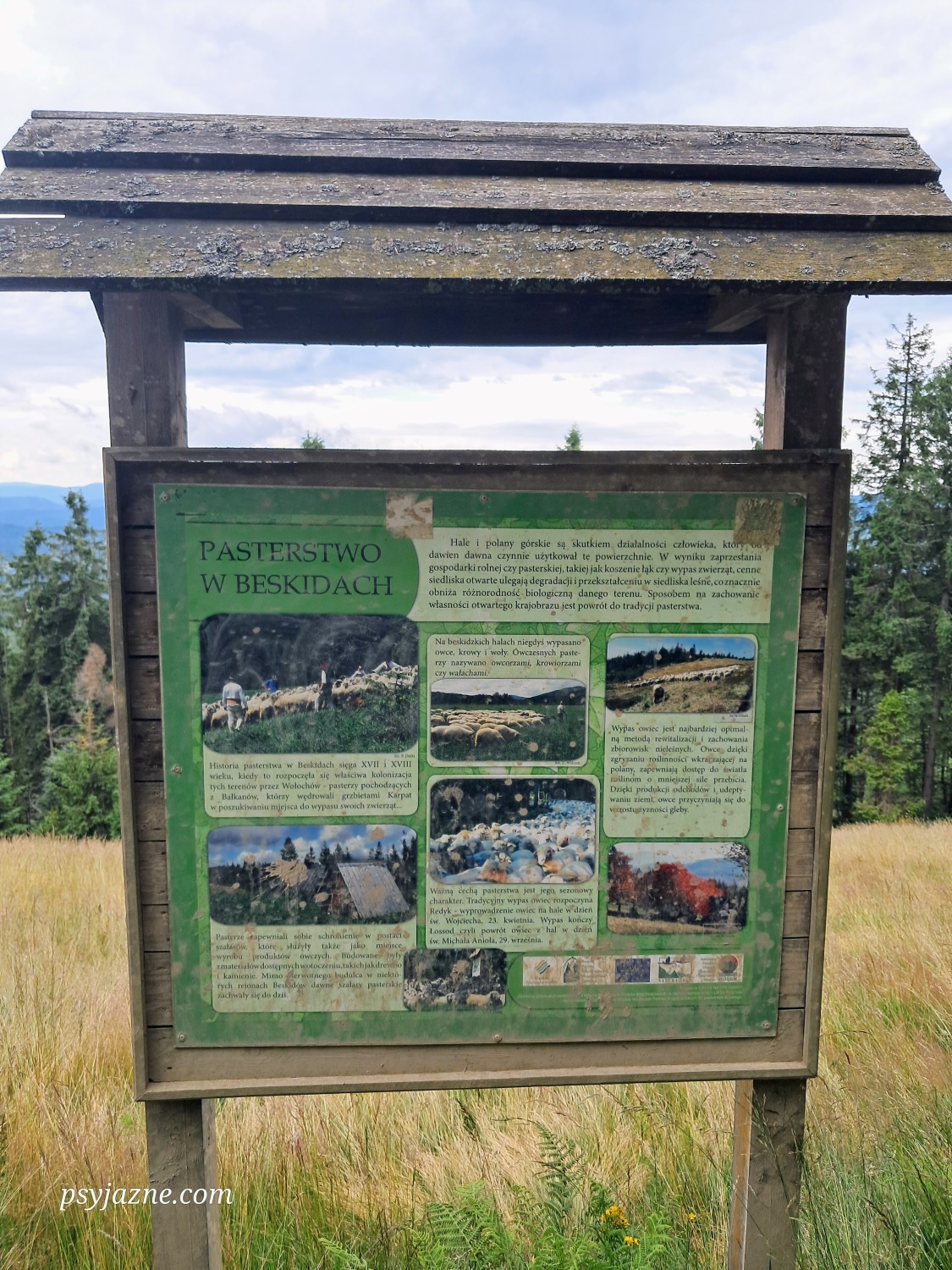 Na dwóch końcach Hali Bacmańskiej ustawione są tablice opisujące pasterstwo w Beskidach.