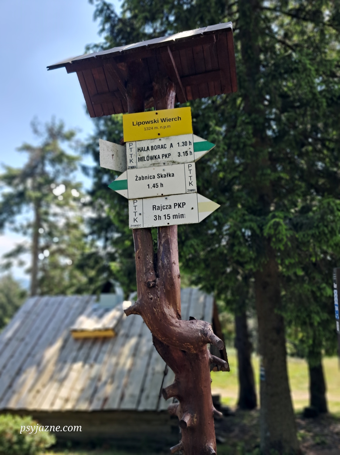 Kilka metrów dalej, Nad Halą Cukiernica jest rozejście szlaków: zielonego i czarnego, który na Hali Redykalnej doprowadzi nas do szlaku żółtego. Obydwa prowadzą pod Lipowski Wierch, ale różnica między nimi jest ogromna. Zielony, biegnący lasem poniżej szczytów: Redykalnego i Boraczego Wierchu pozbawia tych widoków, które oferuje szlak czarny, a następnie żółty. Dlatego wybieramy ten drugi.