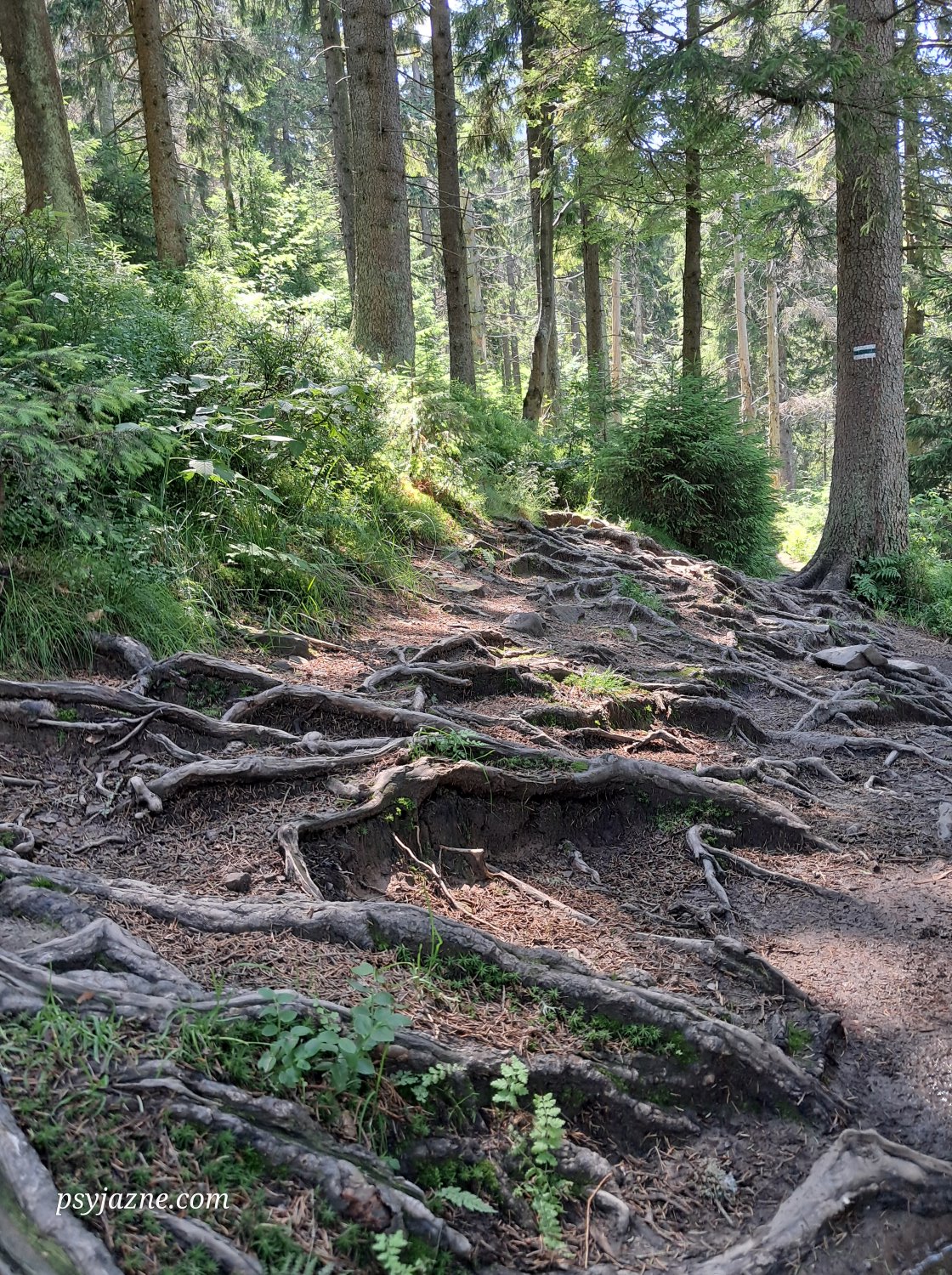 Początkowo, szlak biegnie wąską i krętą ścieżynką najeżoną korzeniami i kamieniami,