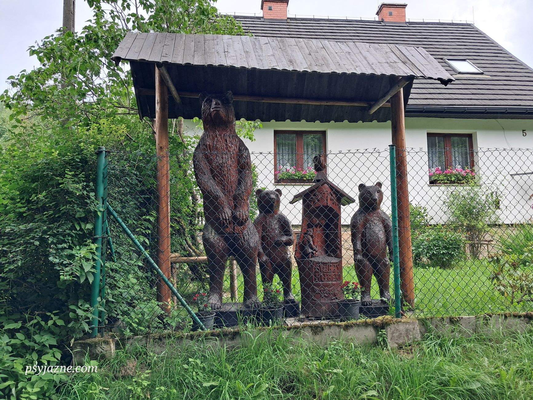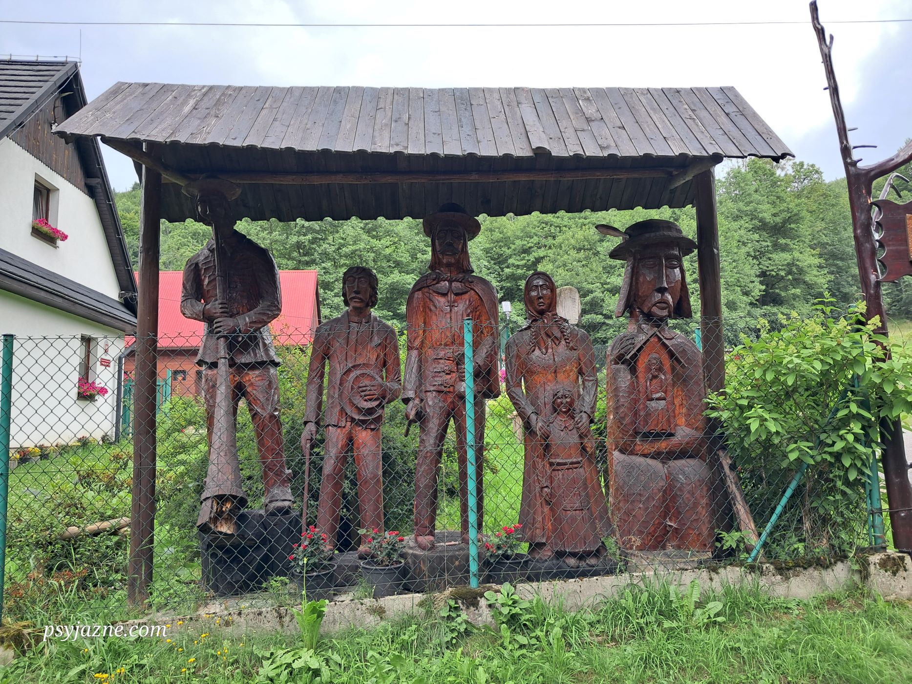 Las okazał się nie tylko dobrym schronieniem przez słońcem, ale również przed padającym deszczem, którego w sumie miało nie być. Ale takie właśnie są góry… Ostatnie 2 km idziemy asfaltem wśród letnich kropel, podziwiając plenerową galerię – park z rzeźbami utworzony wokół domu przez architekta dr Wojciecha Opanię.