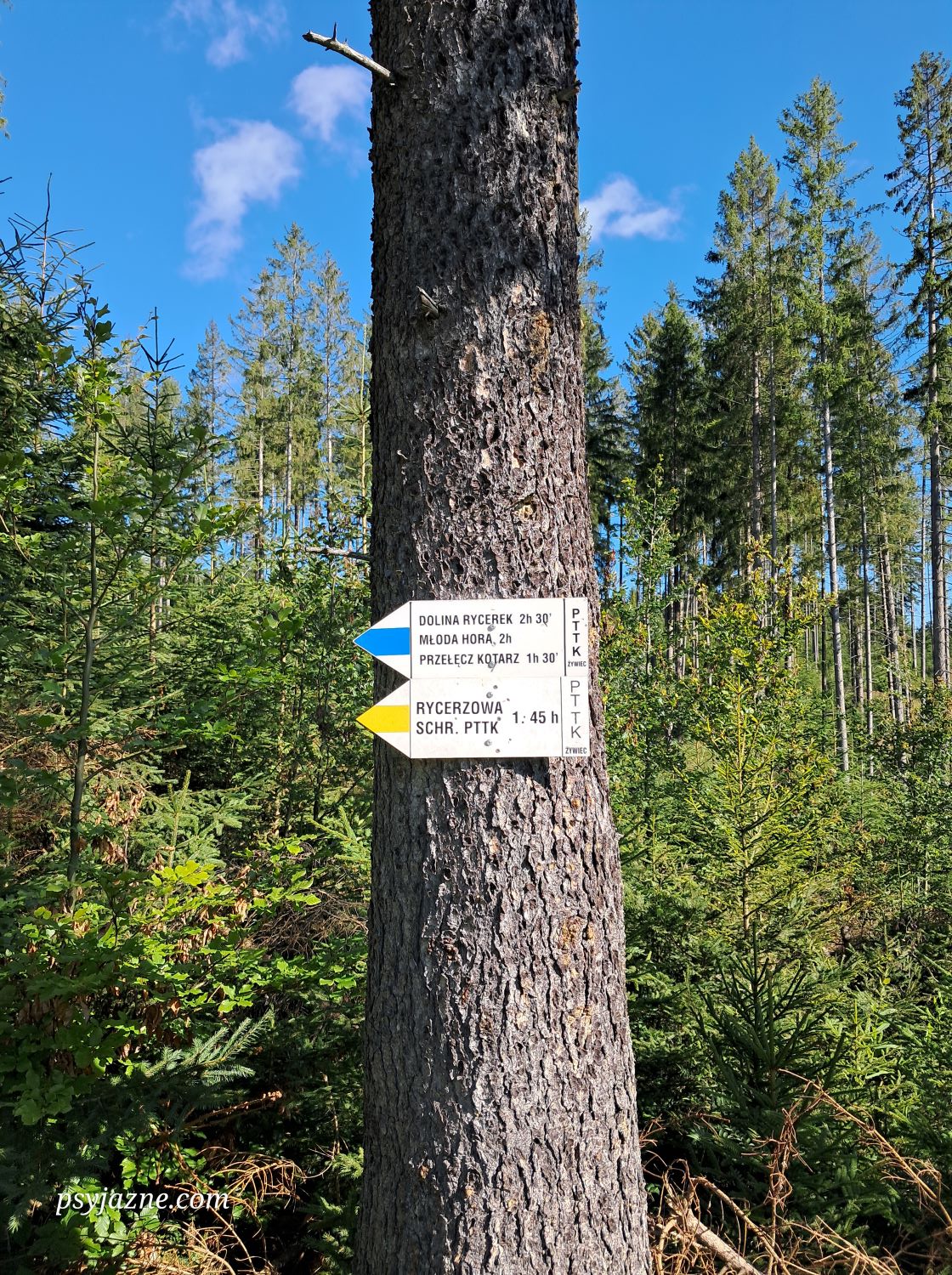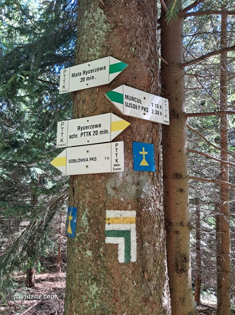 500m dalej, Pod Wiertalówką, do szlaku zielonego dochodzi żółty z Soblówki, a z drogowskazu wynika, że zarówno na Małą Rycerzową, jak i do Schroniska/Bacówki PTTK na Rycerzowej jest zaledwie 20 minut.