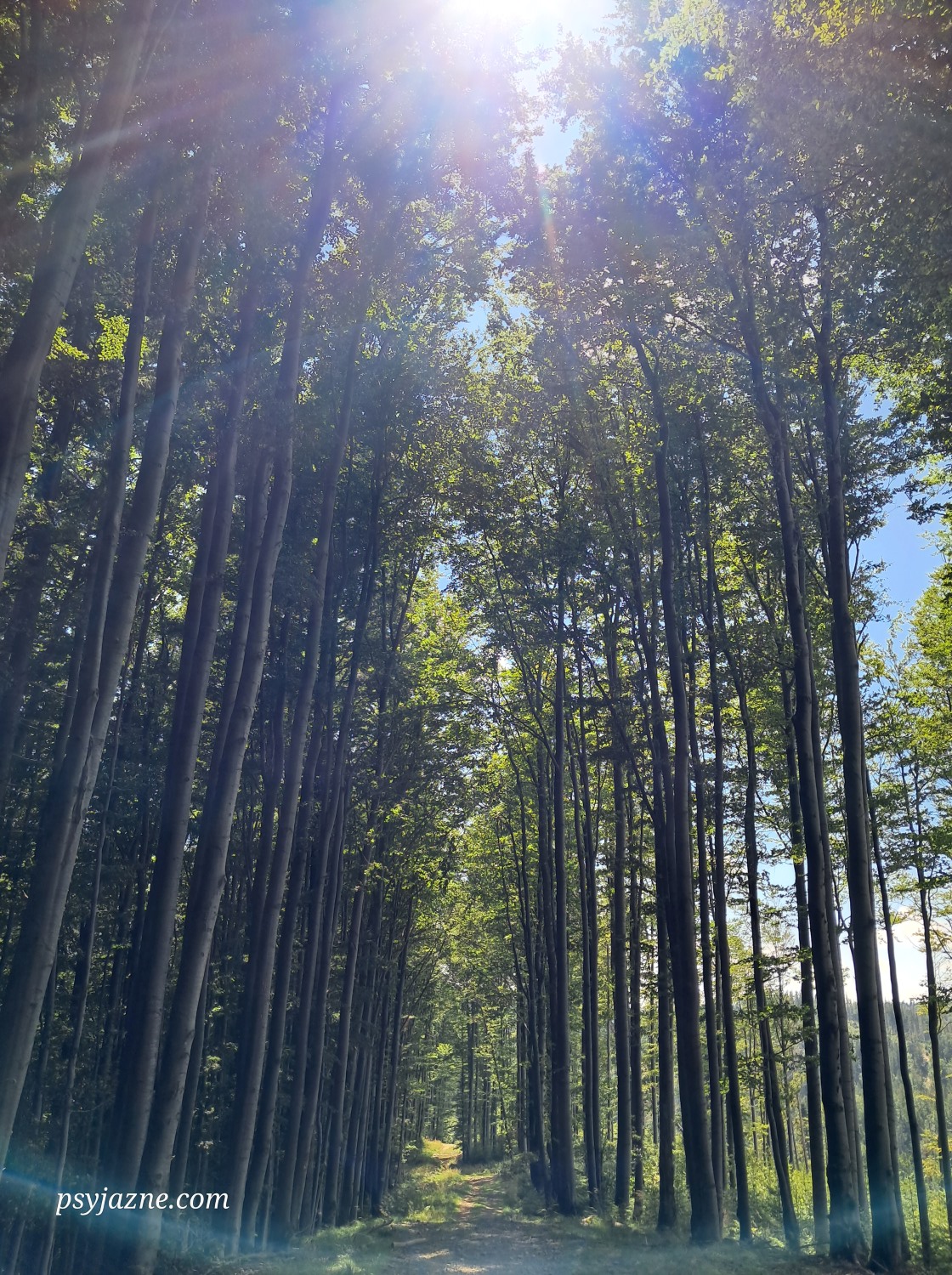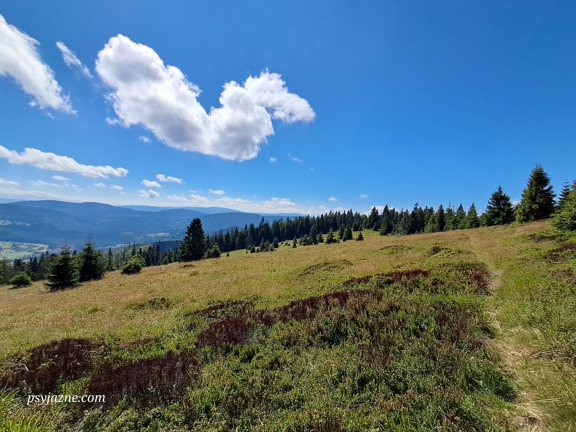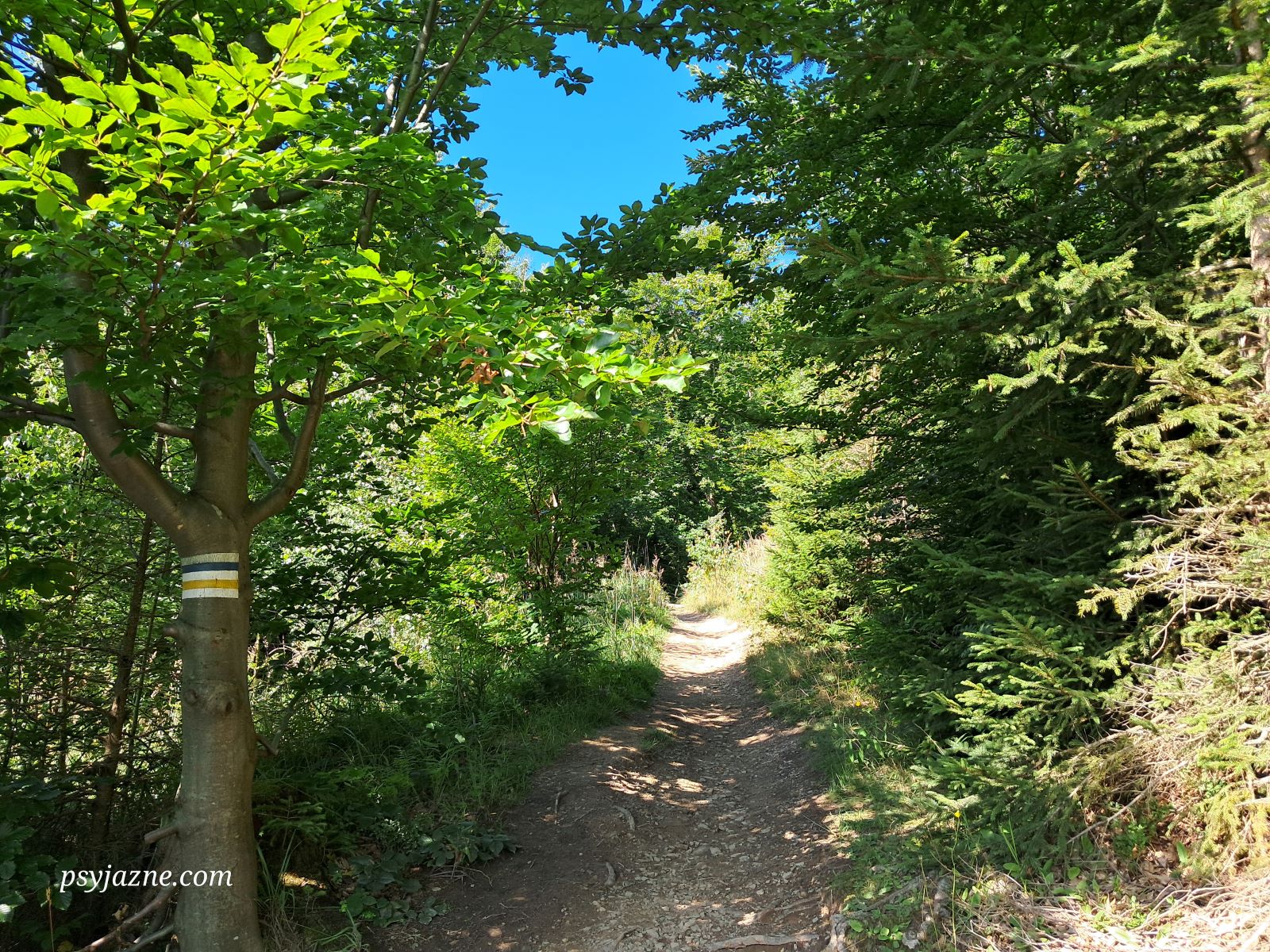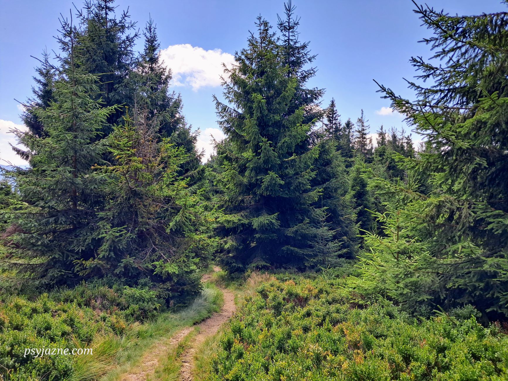 Szlak graniczny, którym schodzimy 1,7km na Przełęcz Przysłop. Początkowo idziemy trawiastą ścieżynką, która stopniowo zanurza się w las, dając nam tym samym schronienie przed słońcem.
