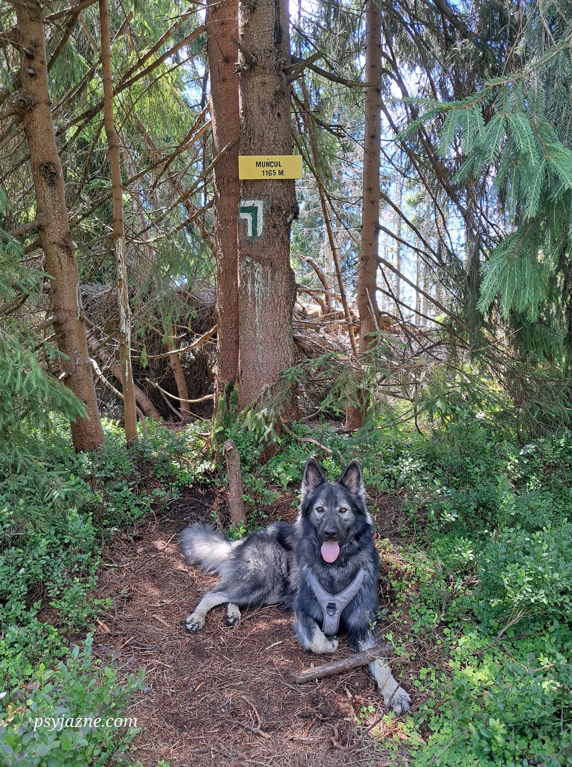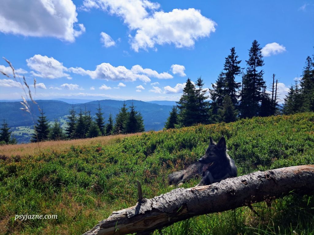 Wędrówkę zaczynamy szlakiem niebieskim, który do skrzyżowania nad Soblówką prowadzi wraz ze wcześniej wspomnianym szlakiem żółtym. Jeszcze zanim dobrze wejdziemy na szlak poranna porcja zabawy i treningu z Hugo na przygotowanym do zwiezienia drewnie.