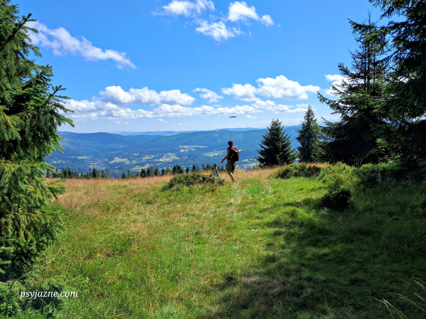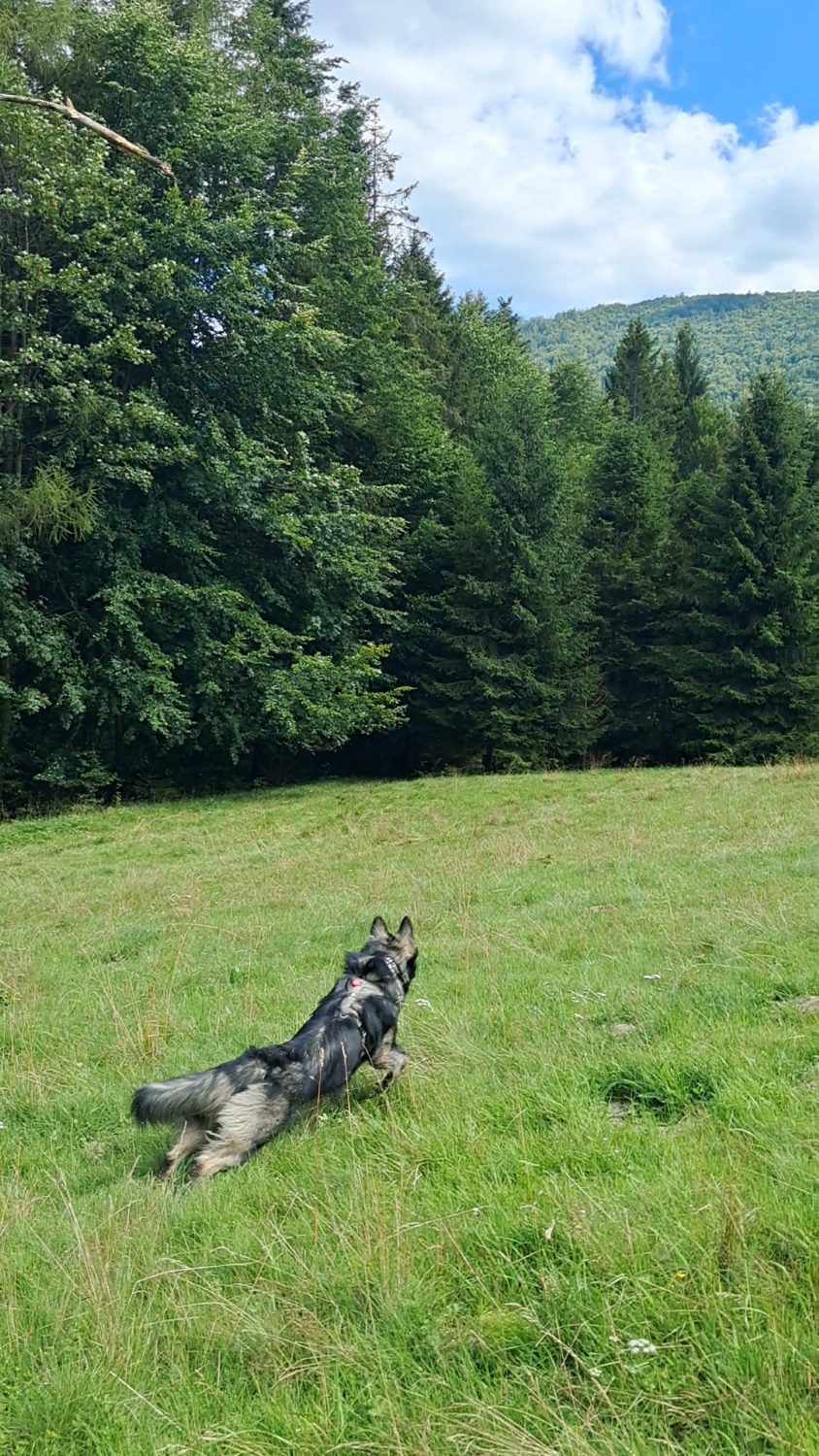 Po króciutkim odpoczynku ruszamy z Przełęczy Przysłop zielonym szlakiem do Soblówki. Przed nami około 5km łagodnie opadającą drogą leśną, która na moment wychodzi na bezimienną polanę. Przystajemy na chwilkę, by pobawić się z Hugo, który ma energii za nas dwojga i spokojnie idziemy dalej.