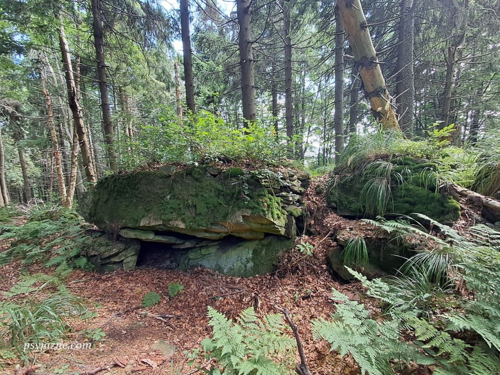 Mniej więcej w połowie drogi uwagę naszą przykuwa niewielka jaskinia. Niespełna 150m przed przełęczą znajduje się odejście żółtego szlaku prowadzącego do Bacówki na Rycerzowej.
