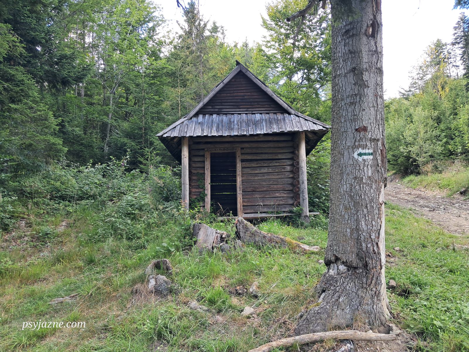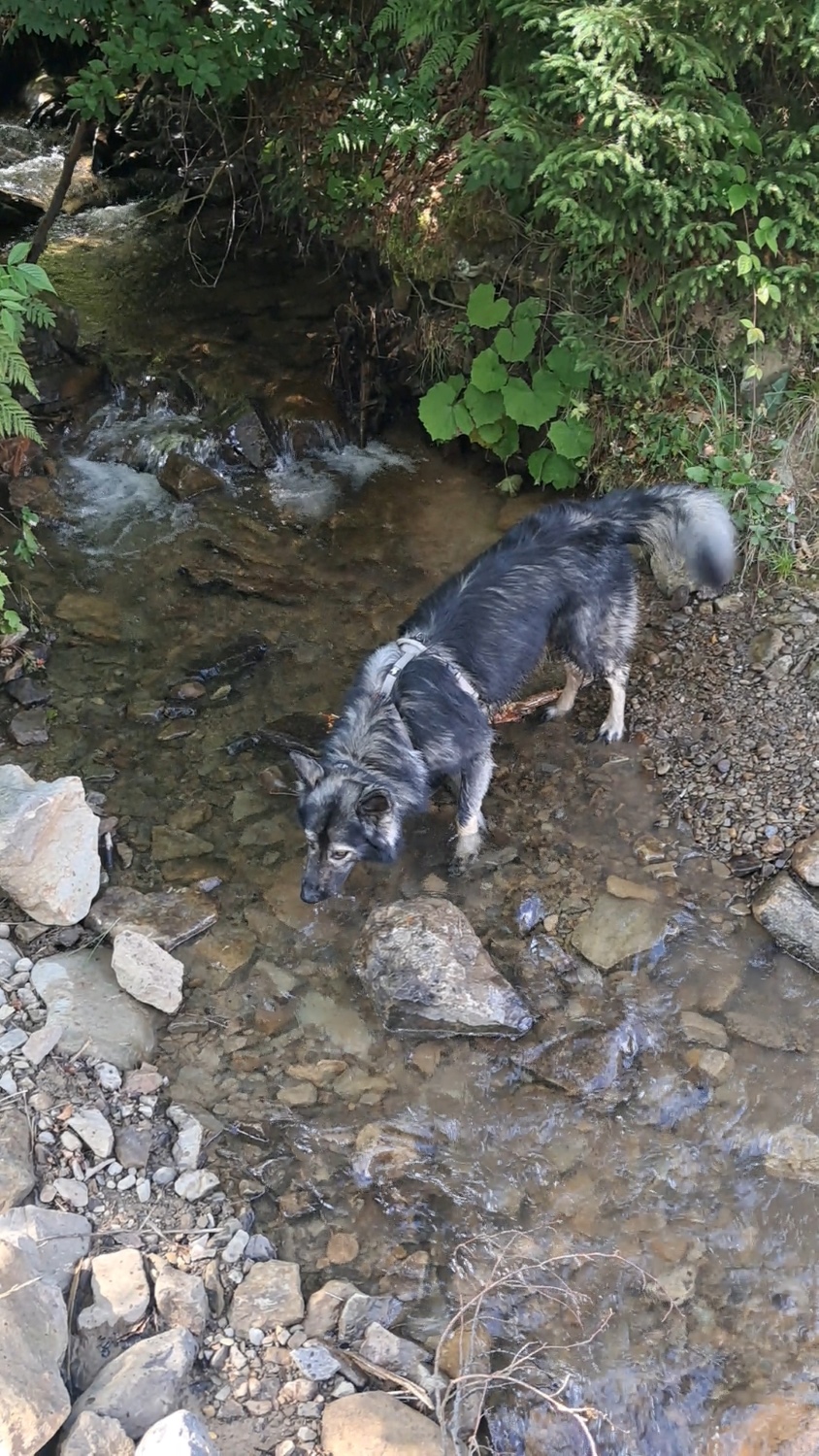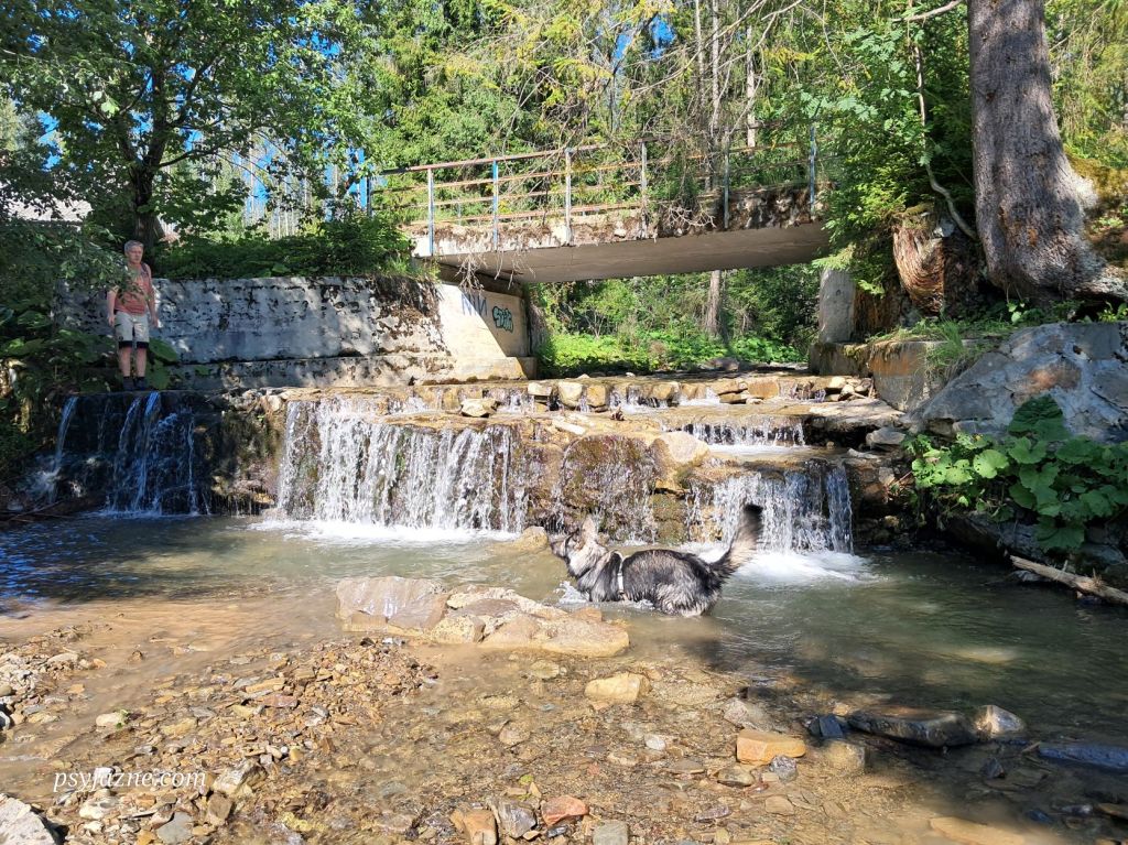 Dosłownie 300m dalej przechodzimy przez mostek nad potokiem Cicha, w którym psiak gasi pragnienie i bryka do woli, a obok którego znajduje się szałas, w którym można się schować w czasie burzy, czy przenocować podczas dłuższej wędrówki.