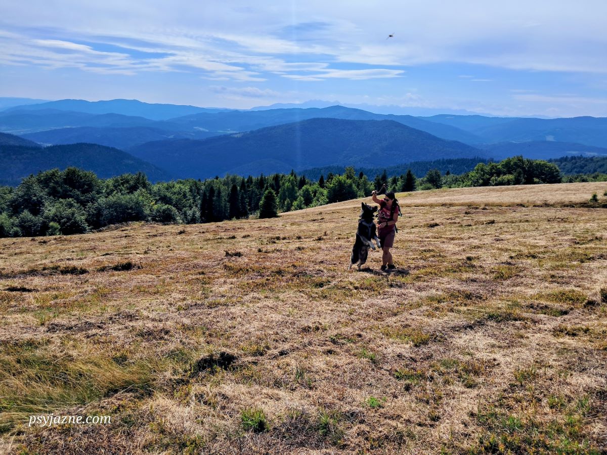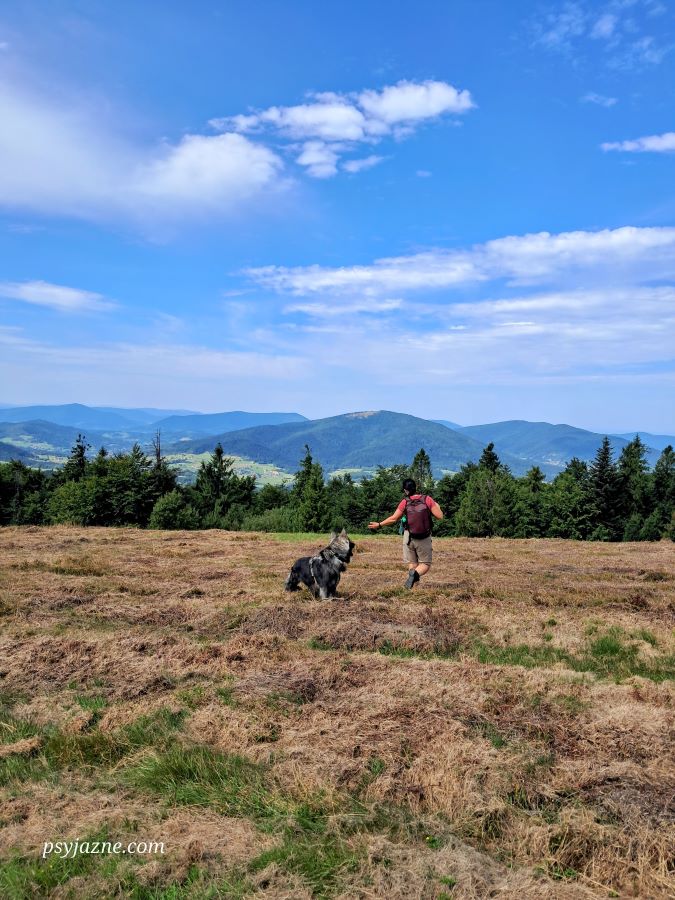 Czas na podsumowanie. Z wyjątkiem pierwszych dwóch kilometrów, które prowadziły drogą asfaltową wśród domów, zza ogrodzeń których zostaliśmy obszczekani, kolejne 12 km zrekompensowało z nawiązką. Na zielonym szlaku nie spotkaliśmy nikogo, na żółtym przed wejściem na dawną halę pasterską: parę biegaczy i rowerzystę. Na samej Polanie było już więcej turystów, ale sto morgów pozwala poczuć się tak, jakby się było samemu. I te widoki, gdzie nie spojrzeć! Na niebieskim szlaku spotkaliśmy zaledwie kilka osób. Trasa nie jest wymagająca, ani pod względem dystansu, ani podejść. By cieszyć się w pełni widokami, warto wybrać dzień bezchmurny, a będąc bez psiego towarzystwa – oczywiście wejść na Mogielicę i znajdującą się tam wieżę widokową. Tradycyjnie zamieszczam link do mapy i życzę cudownych wrażeń z wycieczki!