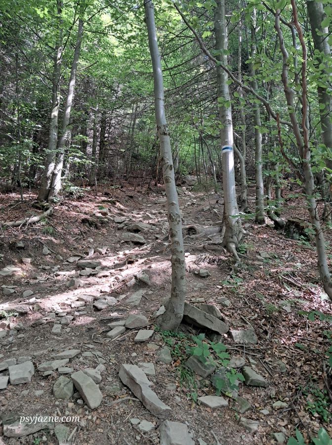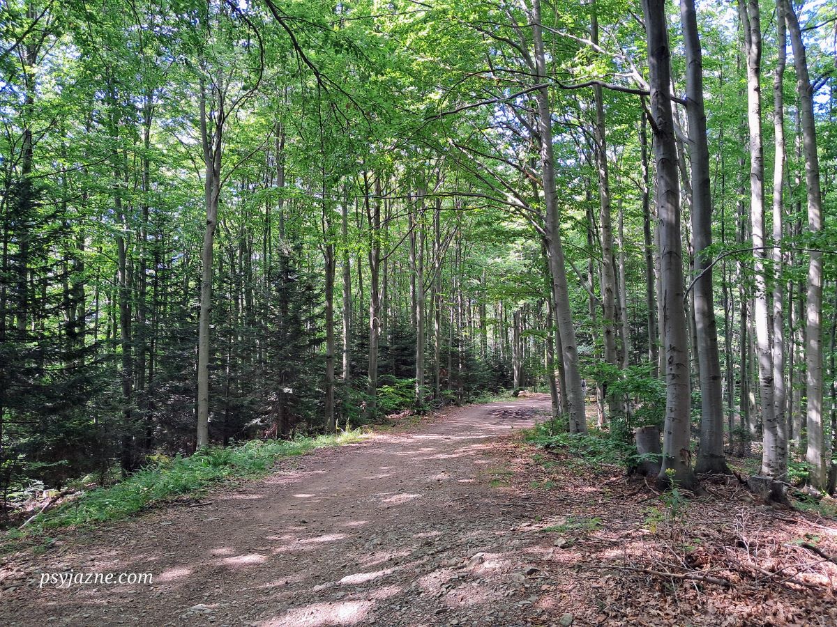 Kilka razy przecina ubitą drogę, którą zwozi się ścięte drzewa. Mniej więcej na wysokości 900 m dochodzimy do miejsca, z którego widoczny jest Ćwilin ze swoją Polaną Michurową.