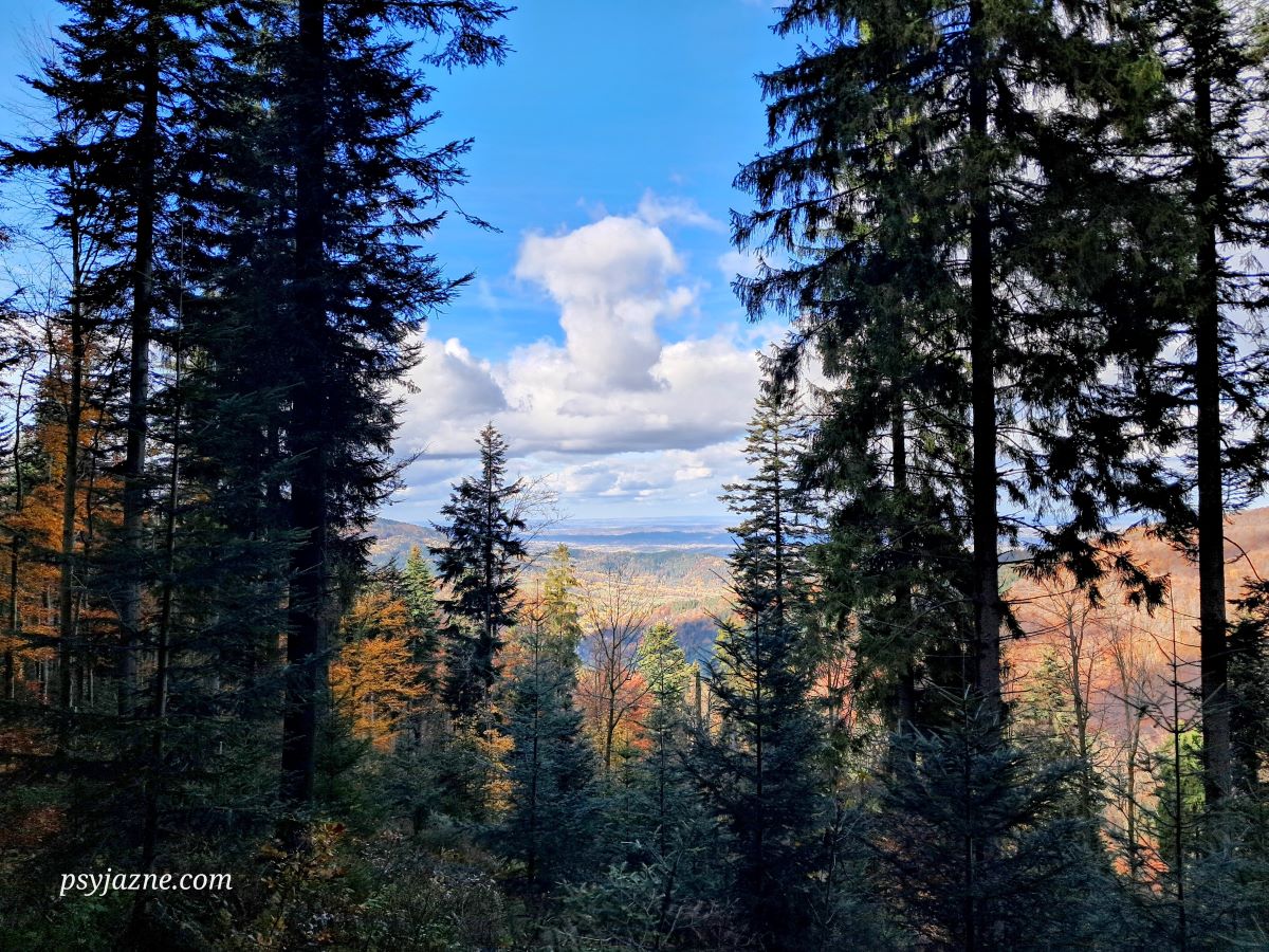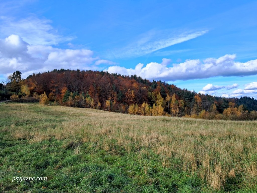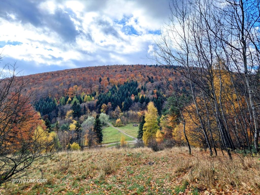 Przed nami ostatni, czterokilometrowy odcinek dzisiejszej wędrówki. Najpierw czerwonym szlakiem schodzimy na Działek skąpany w jesiennym słońcu i kolorach,